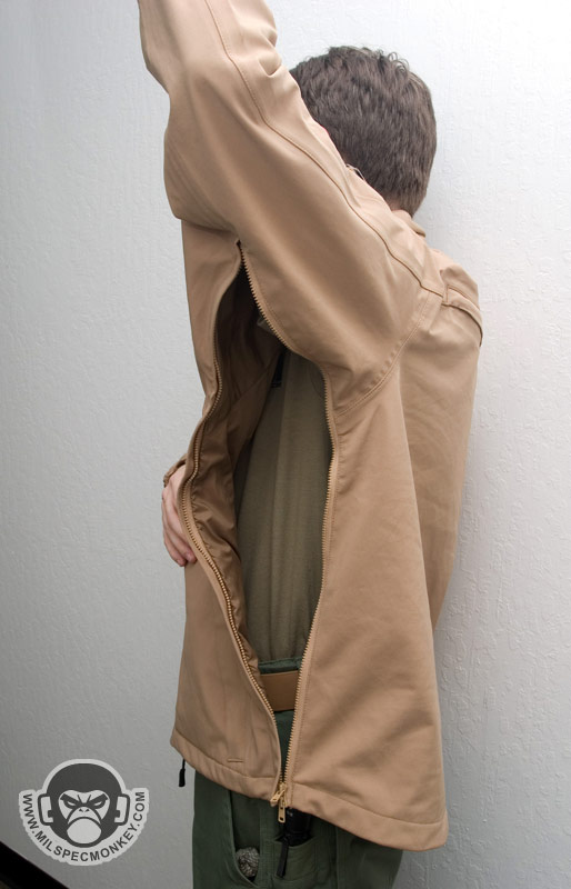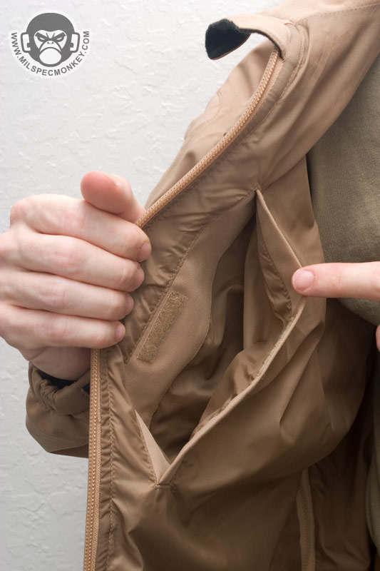 The Sabre Jacket is 5.11's take on a full featured highly weather resistant jacket. The creation is likely a response to the growing demand of high-end jackets. After a brief look-see, the general layout appears very response jacket like, but with numerous additions. Starting with the pockets, there are 2 classic side hand pockets with zipper openings. Flaps are sewn on top of the opening to help with item retention when zippers are open and weather protection. Both shoulders have zippered pockets with highly water resistant zippers. 3"x2" loop velcro areas are also on these pockets so you can mount your favorite cool guy patch. Both sides of the upper chest also have fancy weather resistant zippered pockets. The more central placement is easiest to use for most users, but will be covered by those who wear armor. On the inside of the jacket is a zippered pocket on the left and a velcro sealed pocket on the right. I guess they mix it up to give the user options on speed vs. security.