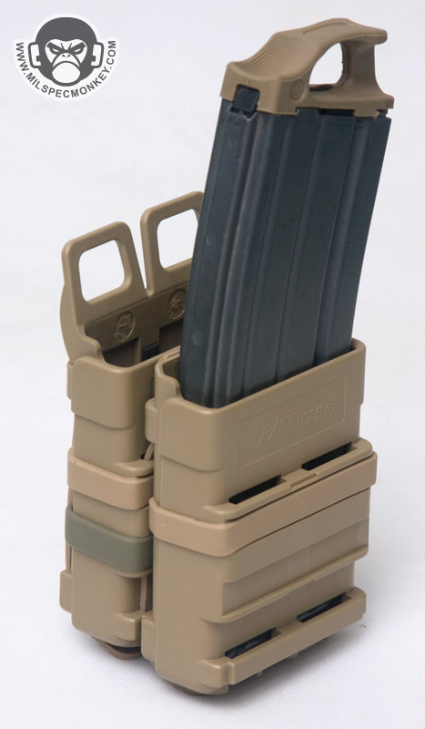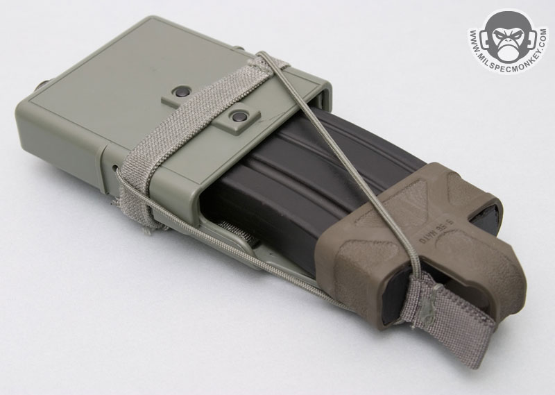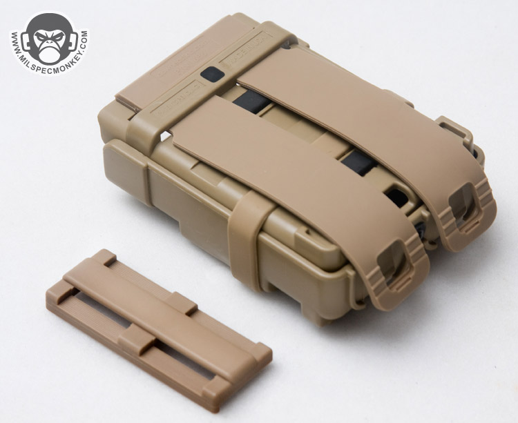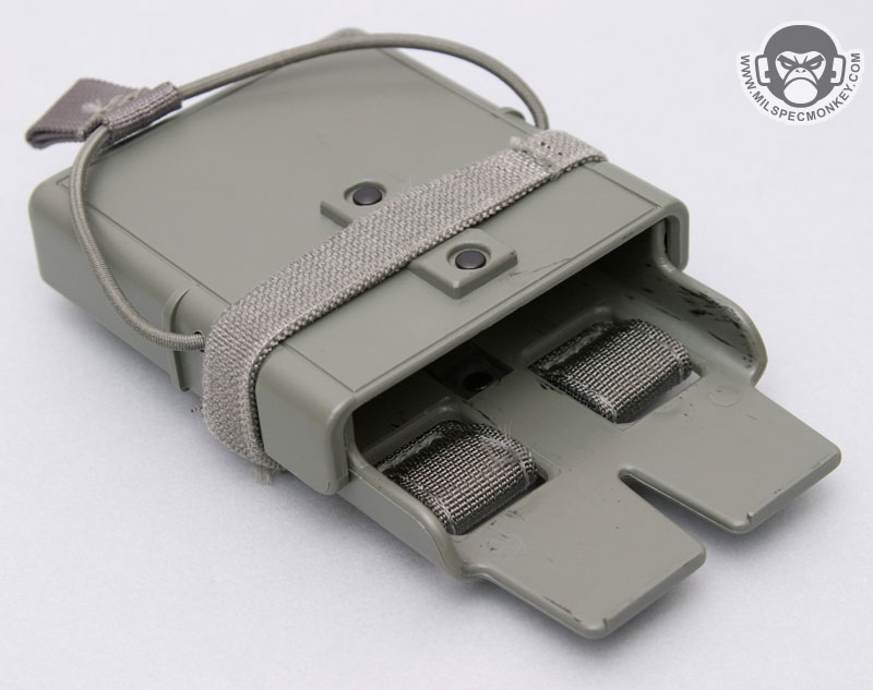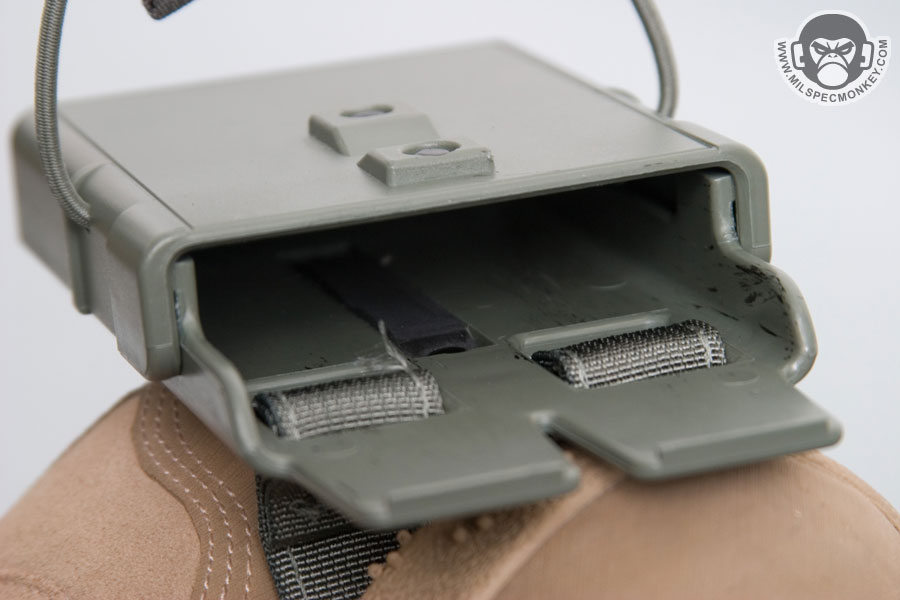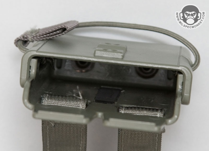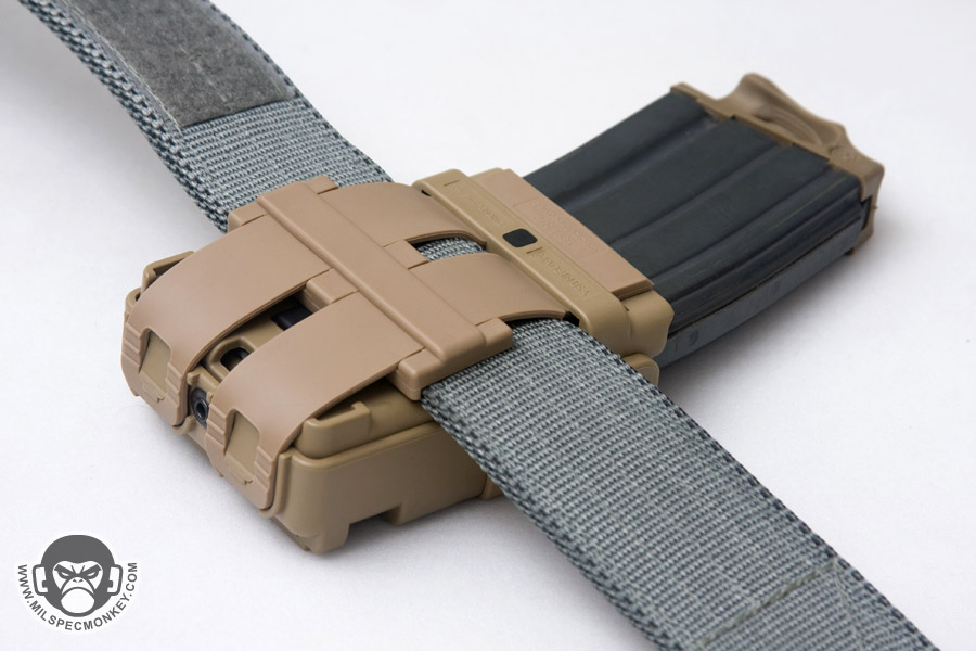 This interesting take on a no flap mag pouch was designed by DownEast Inc. and is being distributed by ITW Military Products. The main idea is to hold 1, 30 round NATO magazine securely with no flaps or straps. The core design is 2 pieces of high-impact resistant polymer that are snapped together at the bottom.