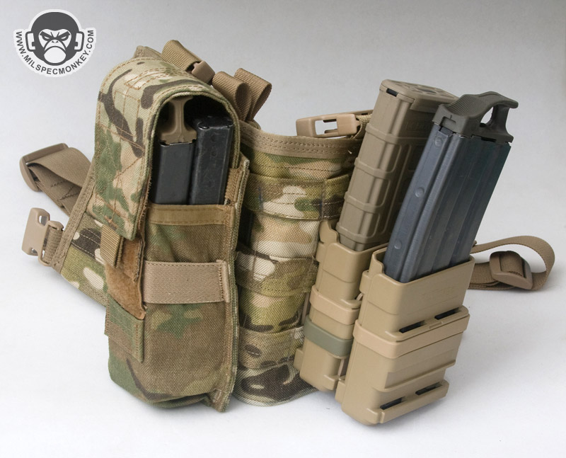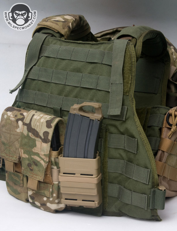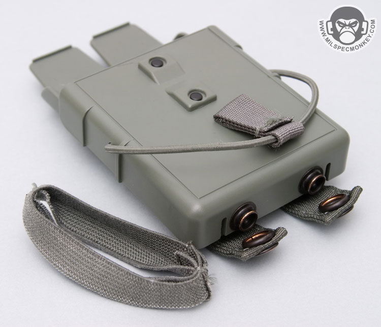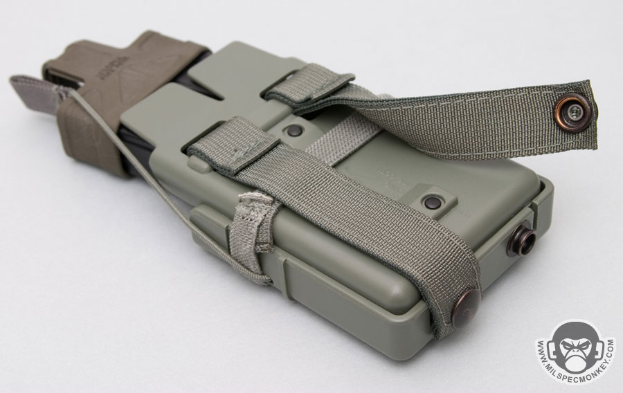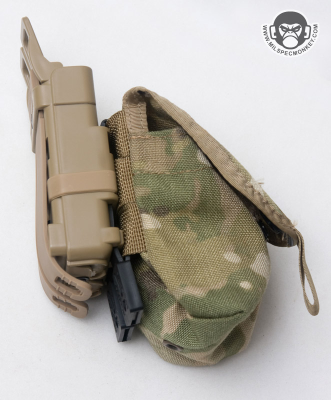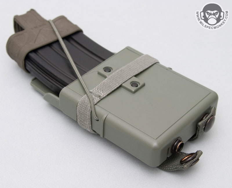 This interesting take on a no flap mag pouch was designed by DownEast Inc. and is being distributed by ITW Military Products. The main idea is to hold 1, 30 round NATO magazine securely with no flaps or straps. The core design is 2 pieces of high-impact resistant polymer that are snapped together at the bottom.