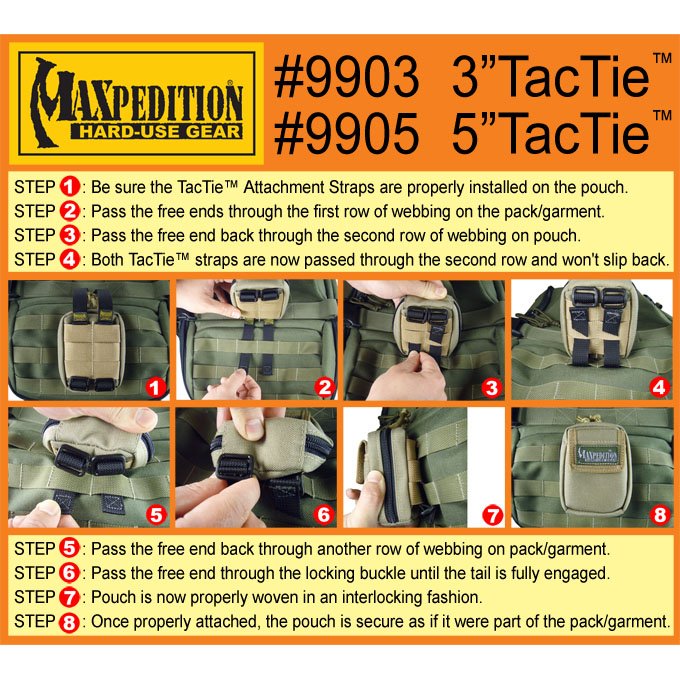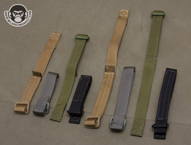 The TacTie is a pretty simple no thrills solution. Just webbing and a plastic tri-glide. The end is folded for security snagging, however cut at an angle to make weaving easier. Pros are that they are affordable, easy to weave, and very resistant to elements. Cons would be that the plastic hardware is a possible point of failure so I'd give them a medium security rating. I'll guess they are not made long enough to weave through both parts of the tri-glide (which would enhance security) to avoid sticking out a little from the mounted item. They come in 3" and 5" lengths which is the equivalent of Malice short and long. Available in Khaki, OD Green, Foliage, and Black to match the majority of kit.