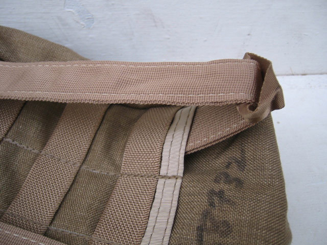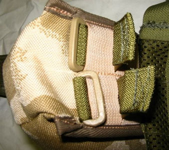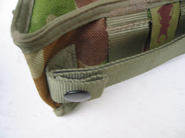 Similar to MOLLE snap, but short webbing is used to get the snap off the pouch itself. Thus the male connection is on the main webbing strip and female connection is on the short webbing strip. This can be an assistant in removing the snaps and aid in security since will snag on the PALS during a snap break. ATS Tactical and BDS Tactical appear to use this method. Photos from <www.militarymorons.com>