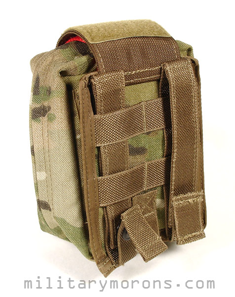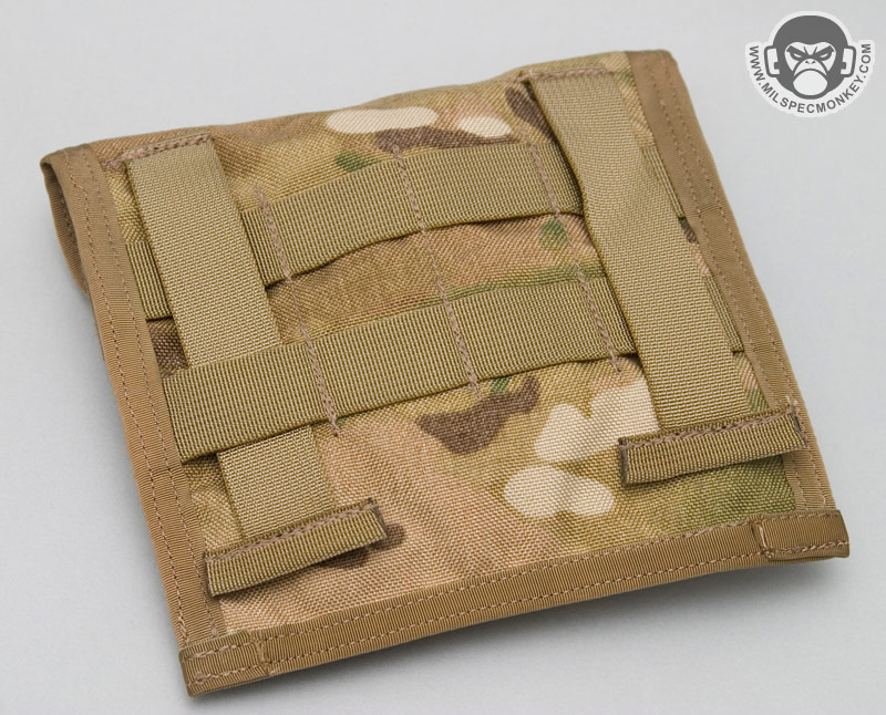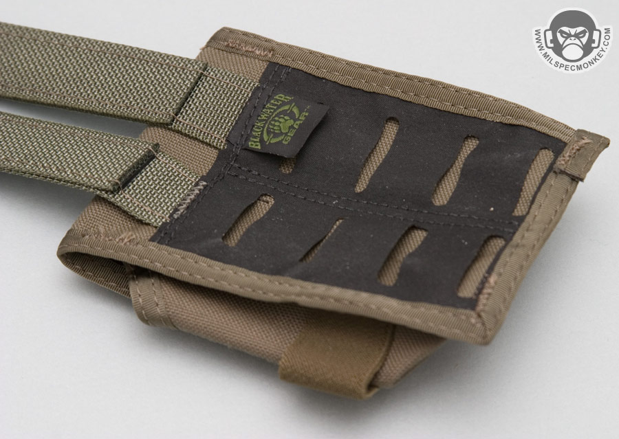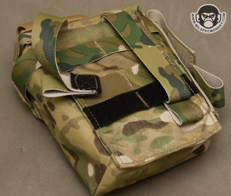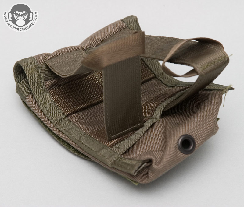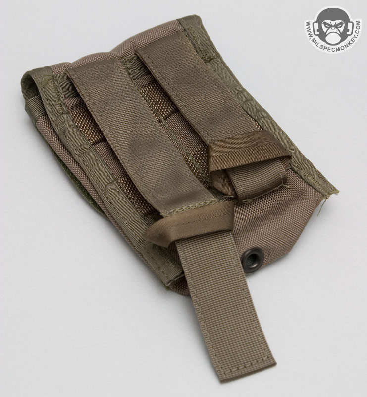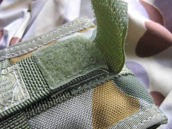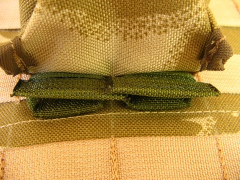 BFG took the velcro secured idea and enhanced the security level. The webbing layout starts similar to a traditional MOLLE Snap, yet at the bottom has a webbing strip that is hook on the interior and loop on the exterior rather than snaps. Once woven, the loop covered webbing tab is tucked under for decent constant pressure. For an important addition, folds are incorporated into the webbing straps to snag if the velcro seal is broken.