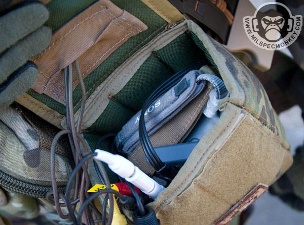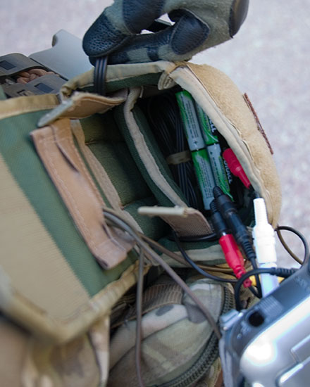 There is a middle padded flap to separate the camcorder from the bottom area where the battery pack goes. To settle down the external wire situation I made a simple velcro shoulder wrap as seen in the last picture. Overall this pouch helps keep the recorder padded and recording without skips even with harsh movements. The latest helmetcam trend seems to be slim full digital recorders now, o well.