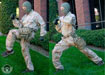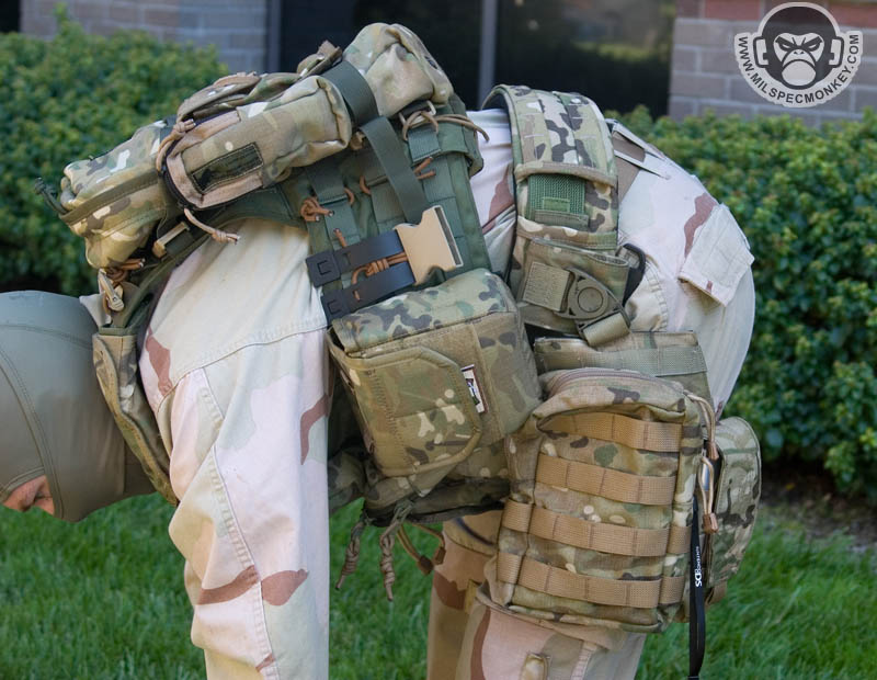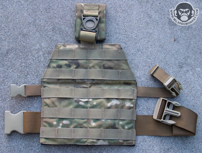 As a result I made this dropleg system to attatch to one's belt and be as high as possible, but the swivi-buckle allows for freedom of movement. The connection can velcro wrap around a standard belt or Malice clip onto a battle belt with PALS. One can also do this directly onto one's carrier/chest rig, but this limits one's lean side to side movement. This is the first run experiment so a little sloppy. Changes planned include moving the 2" leg strap down further and turning the 1" leg strap into a 1.5" strap and rasing it a little. It ended up the way it did since I was trying to get away with just the 2", but didn't work out so added the 1" as an after-thought operation. The buckle size differences are to aid in quicker buckling on reducing confusion which buckle goes where. The back is a sheet of ToughTek antislip material with closed cell foam padding in the middle for comfort. Longer pieces of elastic were used on the leg straps to help in a better fit and elastic loops added to keep extra slack.