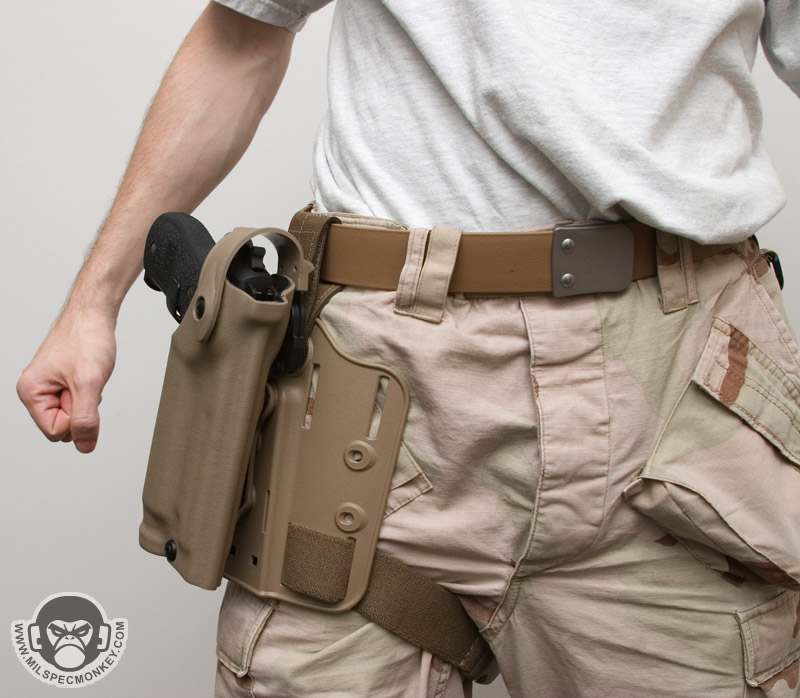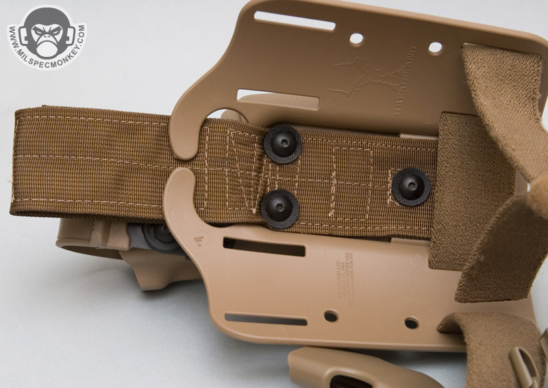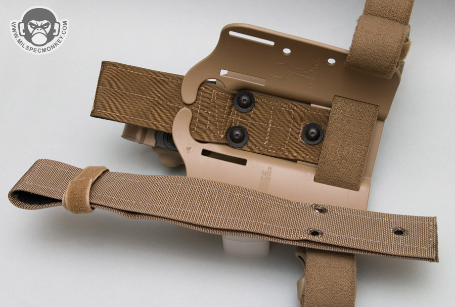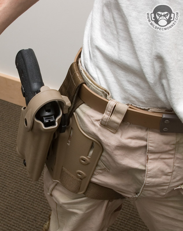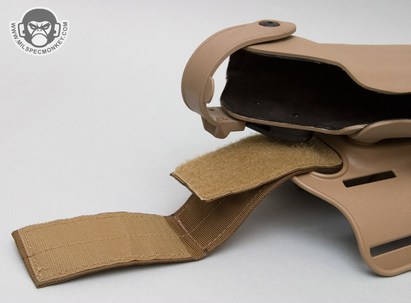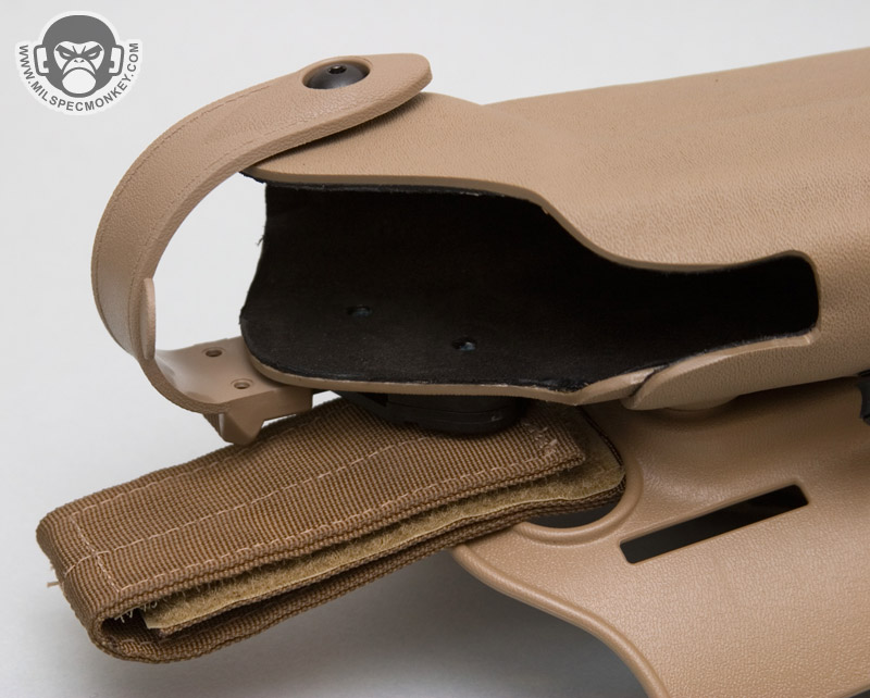 The velcro seal may seem a little risky at first, but since it goes down so far, the holster itself keeps the velcro flap sealed. I thought about using an SRB, but if I were to do so at the same height, the SRB would be in the way of the rotating hood. The velcro flap makes a nice clean slide for the thumb to use the rotating hood.