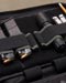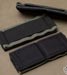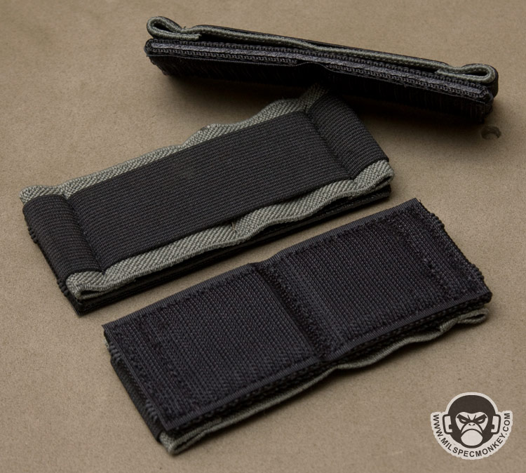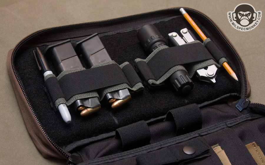 In my initial prototyping phase I started with long elastic strips and soon found out they curl up big time once items were placed inside. After slimming things down I then wanted to provide more holding options while taking up near the same amount of space. The result is two, 2" slots on the inner elastic and a 4" slot on the outer elastic. These are sewn down about .5" from the ends to help prevent the panel from curling and detaching when large items are placed inside. As an unplanned perk, these sewn endpoints form elastic loops that are great for holding pens and markers. To prevent curling even further, thick no joke plastic is used for rigidity. Jumping back to the interior, the base is made out of gripper webbing which gives a mean hold. Thus these panels will hold onto items like pistol magazines and keep their placement much more stable than other loop products.
