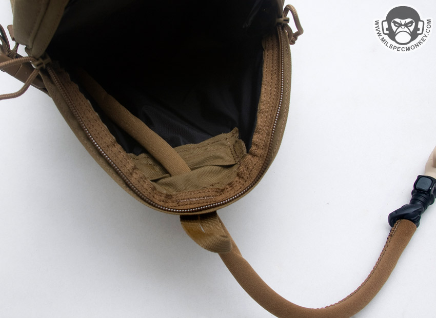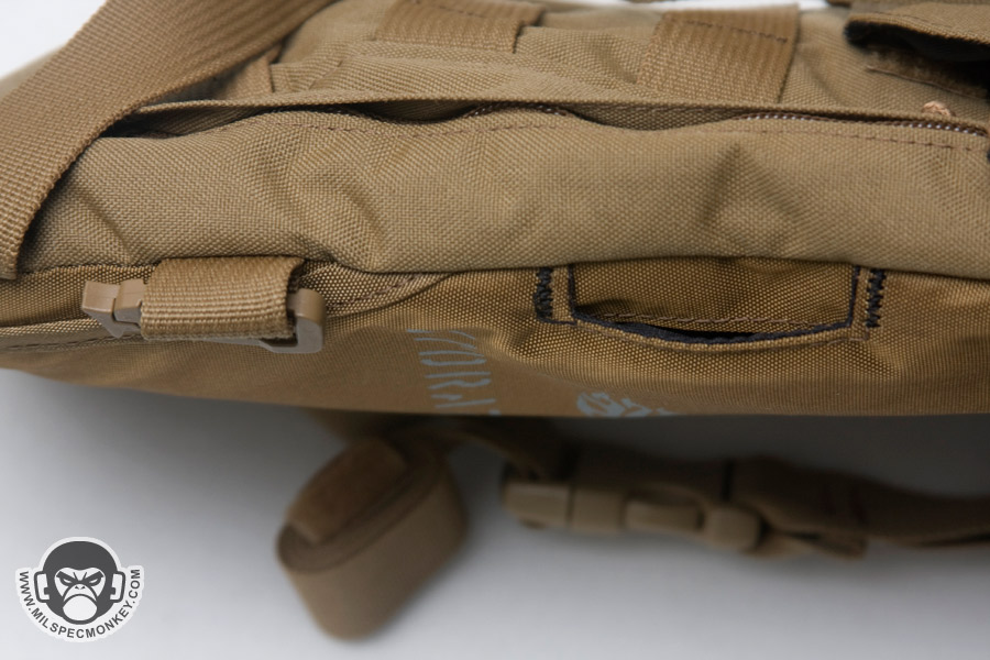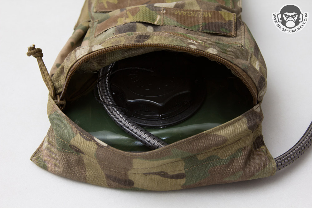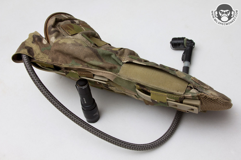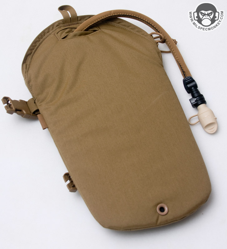 SKD TAC continues to bang out goodies on their PIG line with one of their latest being an assault sized hydration pouch. The approach is very streamlined and lightweight weighing only about 5 ounces with a compact shape. Offhand made to fit the Source WXP 2L Hydration Bladder, other similar sized/shaped hydration bladders will fit in just fine. Since not as wide as the norm, it allows mounting to a vest with plenty of room for other team gear pouches. A great feature is that wide elastic is integrated to help keep a full bladder more flat and even rather than a sad bottom heavy sack.