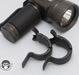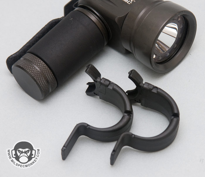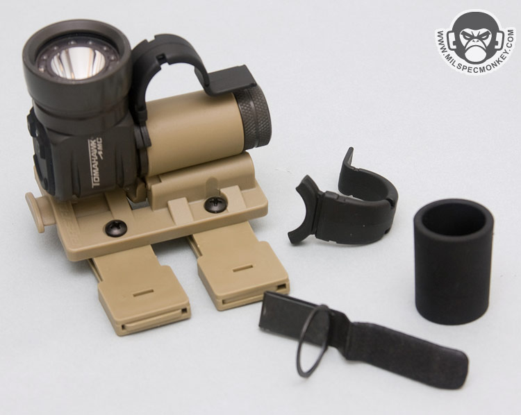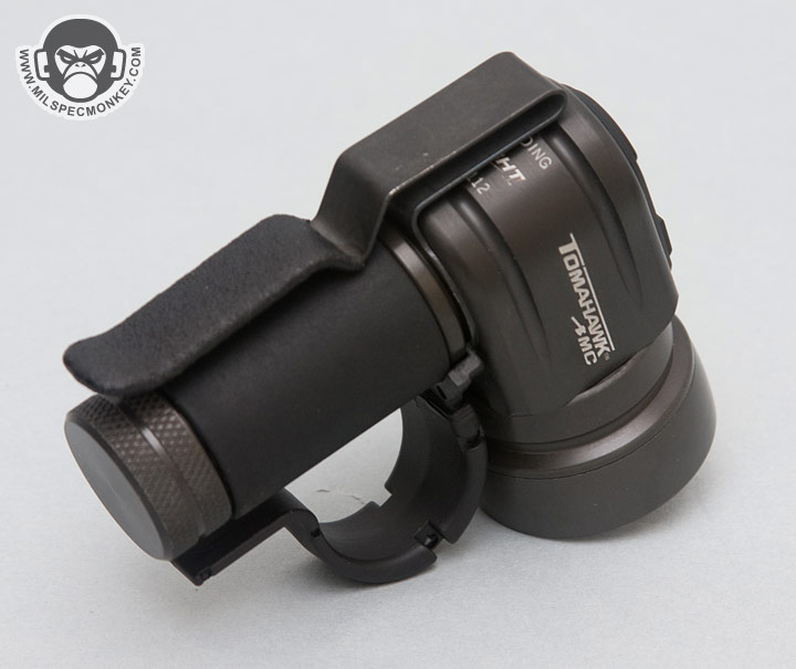 The default metal clip is grand and all, but First Light went a step further to make a custom TRS (Tactical Retention System) mount. The main connection system uses 2 short MALICE clips or MOLLE-LOKs which are screwed onto the the base. These can be detached and rotated to allow the Tomahawk to be mounted in a vertical or horizontal position. When mounted verticaly the light can be rotated left and right and when mounted horizontaly it can be rotated up and down. I mostly see myself desiring up and down rotation capability, however it is all up the user and their needs. To interface with the base the metal clip and grip tube is removed and replaced with a hard tube that has an extrusion to snap into the base. To mount, the Tomahawk easily slides into the TRS base while a thumb button exists for a hassle free release. As a nit-picky note, the connection is a little loose allowing some wobble. This issue is minor though, and overall the TRS is more secure than the metal clip since a button is required to release.