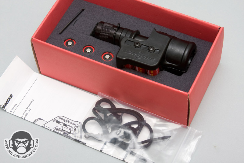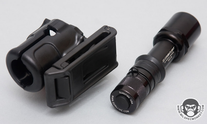 I snagged one of these fun packs at shotshow to check out. Included in the kit is the Z2 LED with batteries, 3 additional batteries to go in the holster, a hex bar to adjust the holster, and to top it off, a lanyard setup. If you liked the original Z2, the LED version is a pretty rockn' upgrade going from the original 65 lumens for 1 hour battery time to a crazy 80 lumens for 11 hours. Looking at those numbers just want to make you go DAMN! It was on the original Z2, but the syringe grip adds great gripping options when using with pistols and helps make a mean grip when extracting out of the holster.