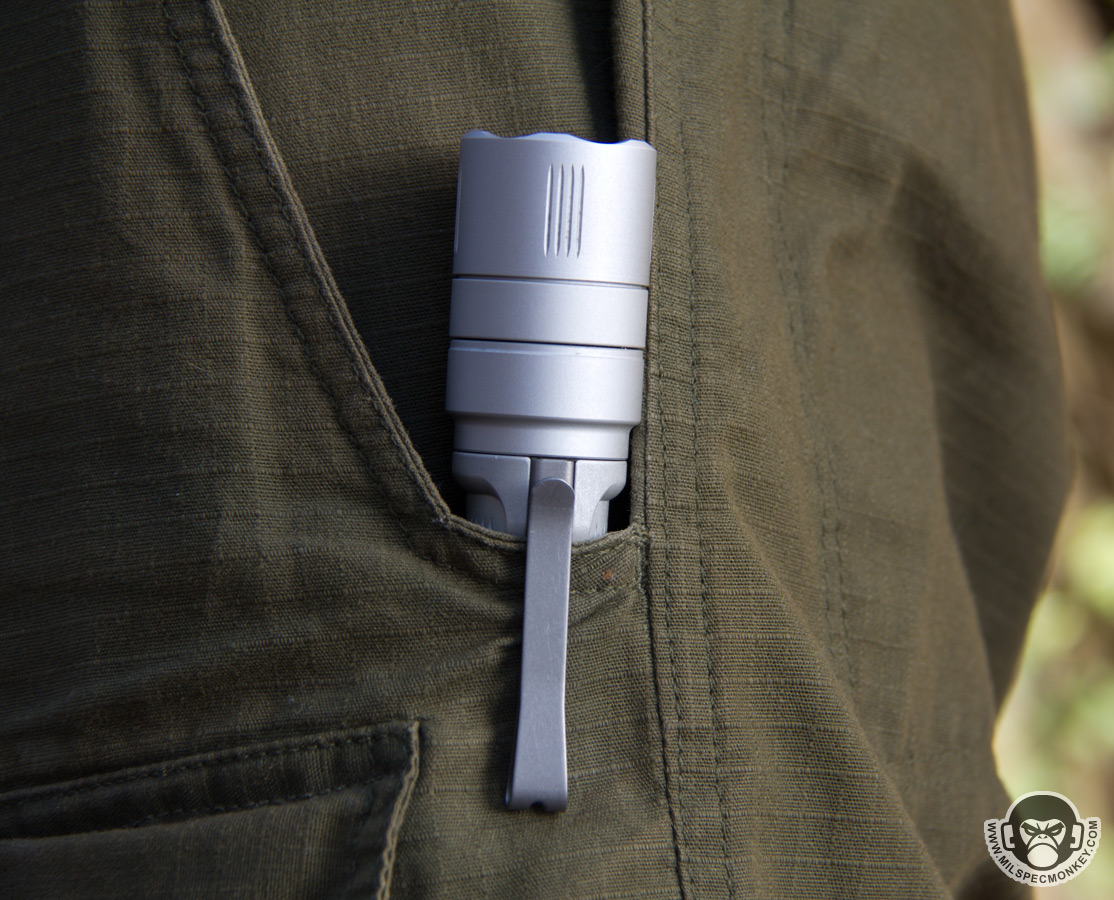 Besides only using one CR123 battery to offer a compact size, another big plus to the EB1 is the pocket clip. It is integrated well made of metal offering good durability and the reversible design allows mounting heads up or heads down. That said I find the heads up retention too loose in a pants pocket so only good for temporary placement, however the functionality works great for mounting to a ball cap to turn the light into a head lamp. As a small upgrade from the older Backup, the EB1 has a hole in the clip for a lanyard lash point.
