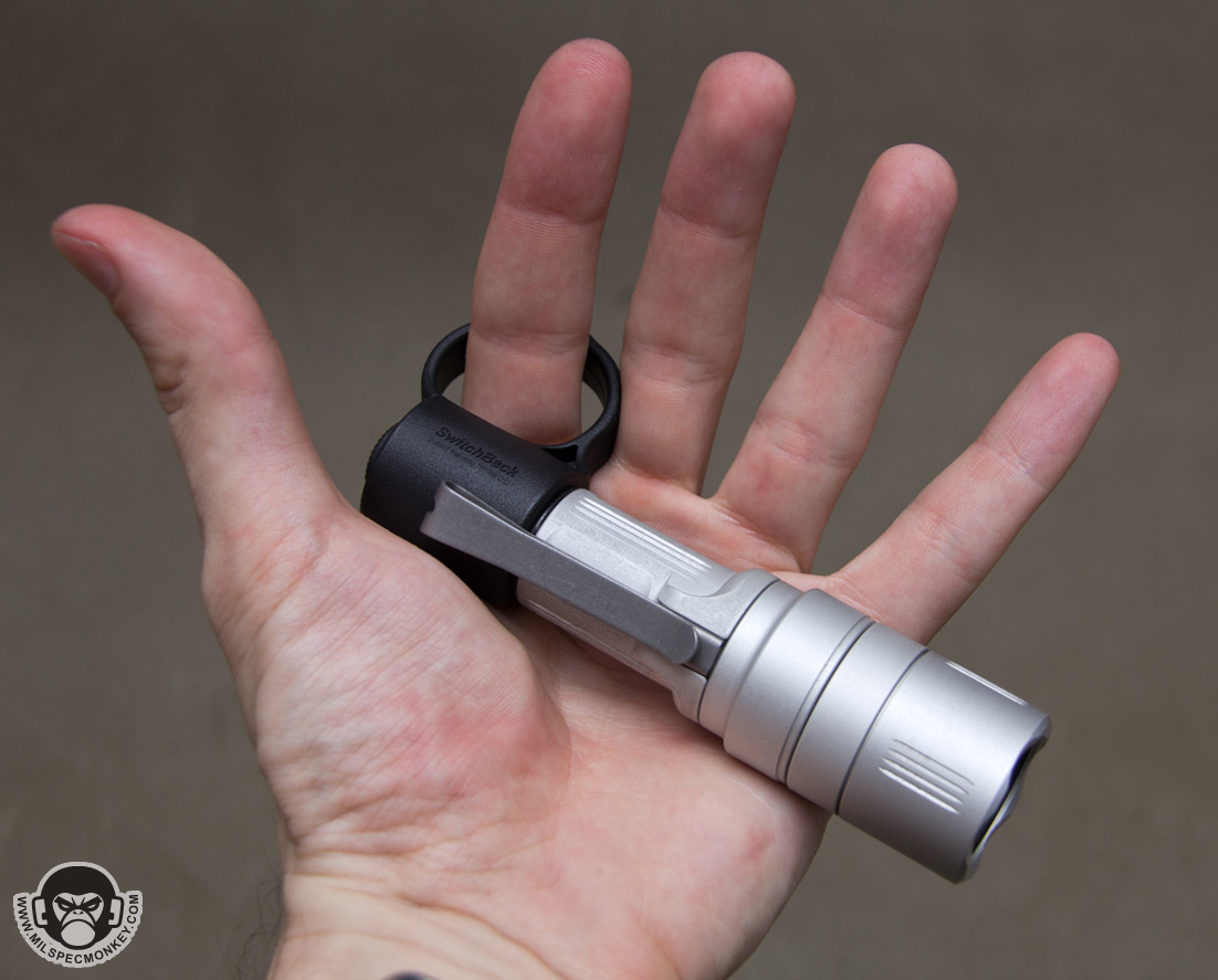 The way the Switchback mounts on the tailcap makes it so you never have to worry about it slipping off, but also makes it only work with the tactical EB1. The gap space created makes it so the tail cap can't be tightened down all the way, thus it can't be put in high powered constant on mode with the Switchback installed. As a small user toggle, if you don't use the additional supplied O-ring for a snug fit, the tailcap can be tightened down to low output constant on mode. The only downside to this is the Switchback ring can rotate around the tailcap freely with a little play, but doesn't effect functionality. As for some monkey hand size notes, I found the Switchback easier to use on a backup sized light since the spacing is a little different on the large / full size light version. On a large size without gloves on in tactical mode, sometimes the button alignment can end up between my fingers instead of on a finger making button engagement difficult. For additional carry notes I like how in a pocket I can hide the Switchback ring in my pocket if trying to be more low key, or have the ring stick out to be easier to grab in a hurry. I also appreciate how the Switchback is not particularly bulky so does not prevent me from doing any of the other modern flashlight carrying methods.