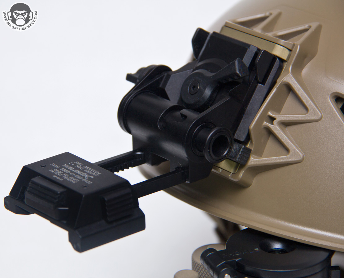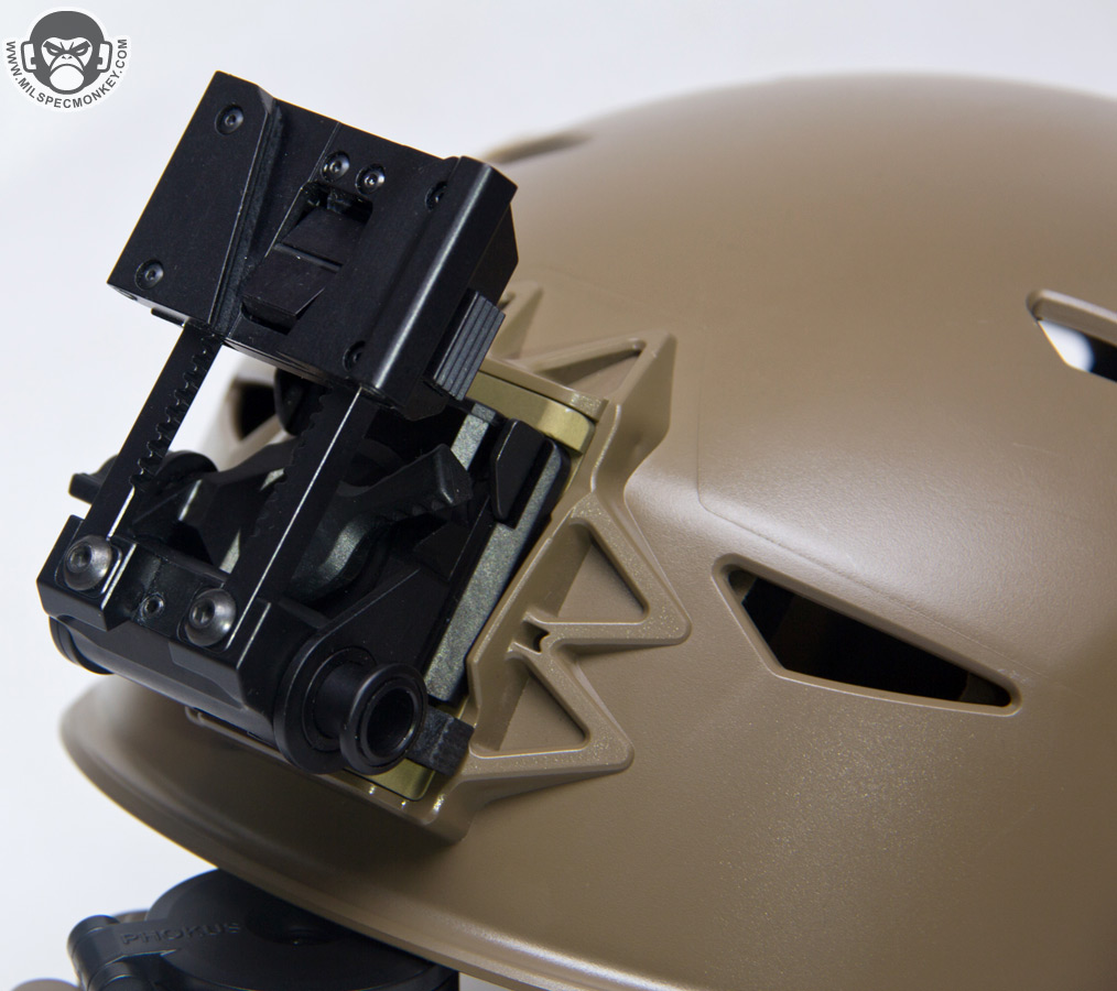 I like how there is a split between the NVG attachment arm and the rest of the mount which offers more NVG storage options on one's self. The NVG plus mount makes a bit of awkward shape when it comes to pouch storage while detaching at the the shoe mount is still a quick way to take on and off while leaving most the mount on the helmet. Somewhat on that subject, the main connection button of the mount to shroud isn't very complicated, however does take some getting used to to put the mount back on while wearing. This is mostly due to the not being able to see it factor, however releasing is much easier. Another cool function is that the main shroud connection can be set to a hard connection or a break-away setting. This setting basically just adjusts how far the main lock bar goes into the shroud and when in the breakaway setting it is enough to be a solid fit yet will allow breaking away with heavy force. This way one can have a full lock when just hard using on the ground, yet have the option for break away when doing high speed stuff like fast roping where it would be better to lose snagged NVGs than to break one's neck.