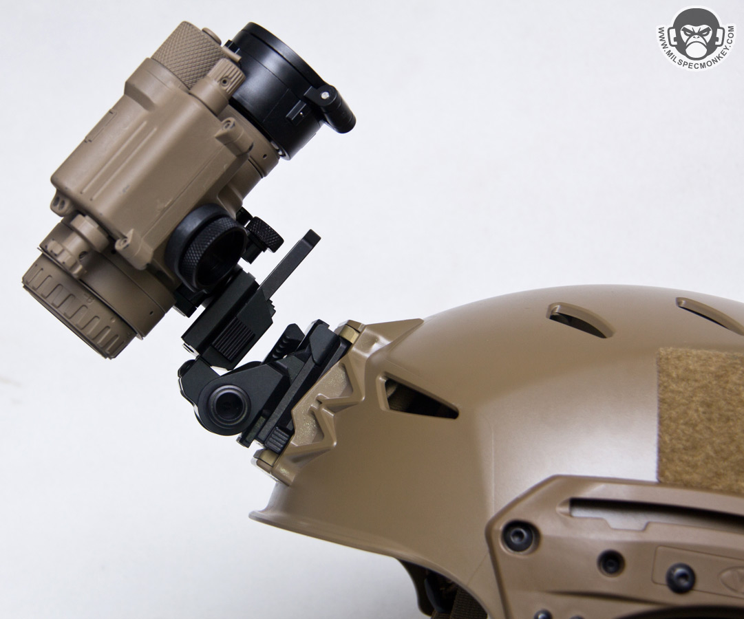 The L4 G24 Mount allows attachment of a variety of NVGs to a MICH/ACH helmet using an Ops-Core VAS, standard Army shroud, and similar mount setups including Wilcox's own shrouds. Made of light weight Aerospace grade metal the mount feels like a solid piece of gear like that expected in high end AR-15 accessories. For other first hand impressions it seems like there is a lot going on and frankly there is to offer all the adjustability options. I try and show all the angle and distance adjustment options in the pics, but also attached the manual which helps convey it even further. I was happy to see I could really dial in the angle and distance from my face, even eye side. Although made clearly as NVG on left eye design priority, pretty cool that eye switching is still available. The finer adjustment knobs and levers are a little harder to get to which makes sense as generally one doesn't want to mess with them once dialed it while the main up/down button is fairly easy to activate. Although the main up/down button is on the left side it is still easy to access and activate with either hand. The eye distance adjust buttons are different yet also fairly easy to engage to adjust between wearing goggles or not.