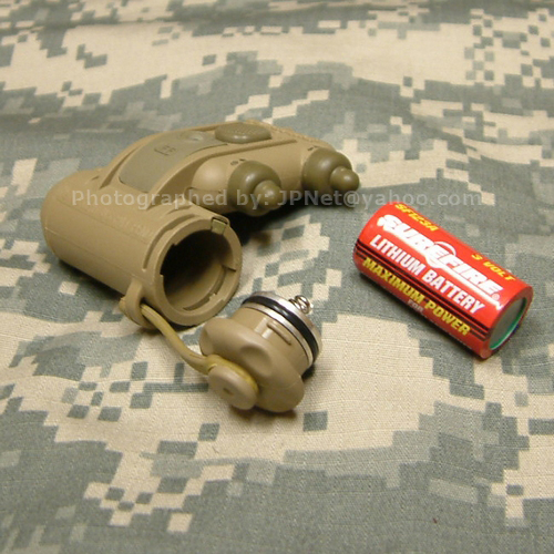 This compact helmet light is molded out of a sturdy, tan-colored polymer with the SureFire logo in raised lettering above the brightness adjustment button. The brightness adjustment button and toggle switches are covered with dark brown rubber. The IFF LED has a soft, khaki-colored cover with "IFF" recessed below the actual IFF LED. The battery compartment lies at the bottom of the helmet light assembly and has a battery cover complete with o-ring. There is a thick rubber lanyard attaching the battery cover to the helmet light.