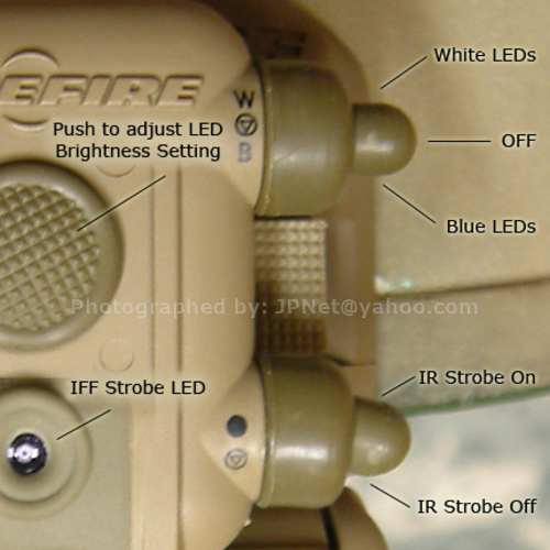 Selecting the different light modes is a simple task. Two toggle switches on the right and the brightness adjustment button in the center of the helmet light control all the functionality of this mini monster. The toggle switch on the top controls the white and blue LEDs. There are small, but readable, icons next to the toggle switches on the helmet light to indicate "white LEDs," "blue LEDs," "off," and IFF IR LED strobe "on" and "off." If you can understand these icons you don't need the user manual. But just in case... Up turns on the white LEDs, down turns on the blue LEDs and the neutral position is off. The bottom toggle switch is even simpler - up turns on the IR strobe and down turns it off. While this setup is very easy to use and conveniently placed, I have had instances where I have had a ND (negligent discharge) when attempting to switch light modes since they are close together, so watch your fingers.