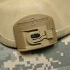 The helmet mount has a darker tan rubber molding with raised dimples on the side that contacts the helmet and has a deeply recessed SureFire logo at the top. Molded into the helmet mount is the release mechanism which has a square, checkered paddle for easy use. This release mechanism, while easy to use, is still strong enough that I am not worried about the helmet light falling off. On the back is a simple metal bracket which secures the mount to the helmet via two small machine screws. The mount can be attached with or without the camouflage helmet cover on. However, it would be difficult to use/attach the helmet light if the helmet mount was attached before the helmet cover was placed on the helmet so decide if you want a helmet cover on or not before you install the mount. It really isn't difficult to take the mount off and on to replace the helmet cover but it will save you the hassle of having to redo it every time.