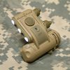 The SureFire HL1-A-TN attaches to the helmet mount via a horseshoe-shaped bracket molded into the case. This slides into grooves on the helmet mount, fitting snuggly and with little wobble. Because of the horseshoe shape there is little chance of improperly reattaching the light to the helmet mount. This design is similar to the "hot shoe" found on some cameras which can use an external flash. SureFire has said that it will release a MOLLE compatible adapter to attach to your plate carrier/vest/chest rig/etc allowing this helmet light to double duty as a task light (ie: Quiqlite). To detach, simply press down on the checkered square paddle located between the two toggle switches and slide the entire helmet light assembly forward.