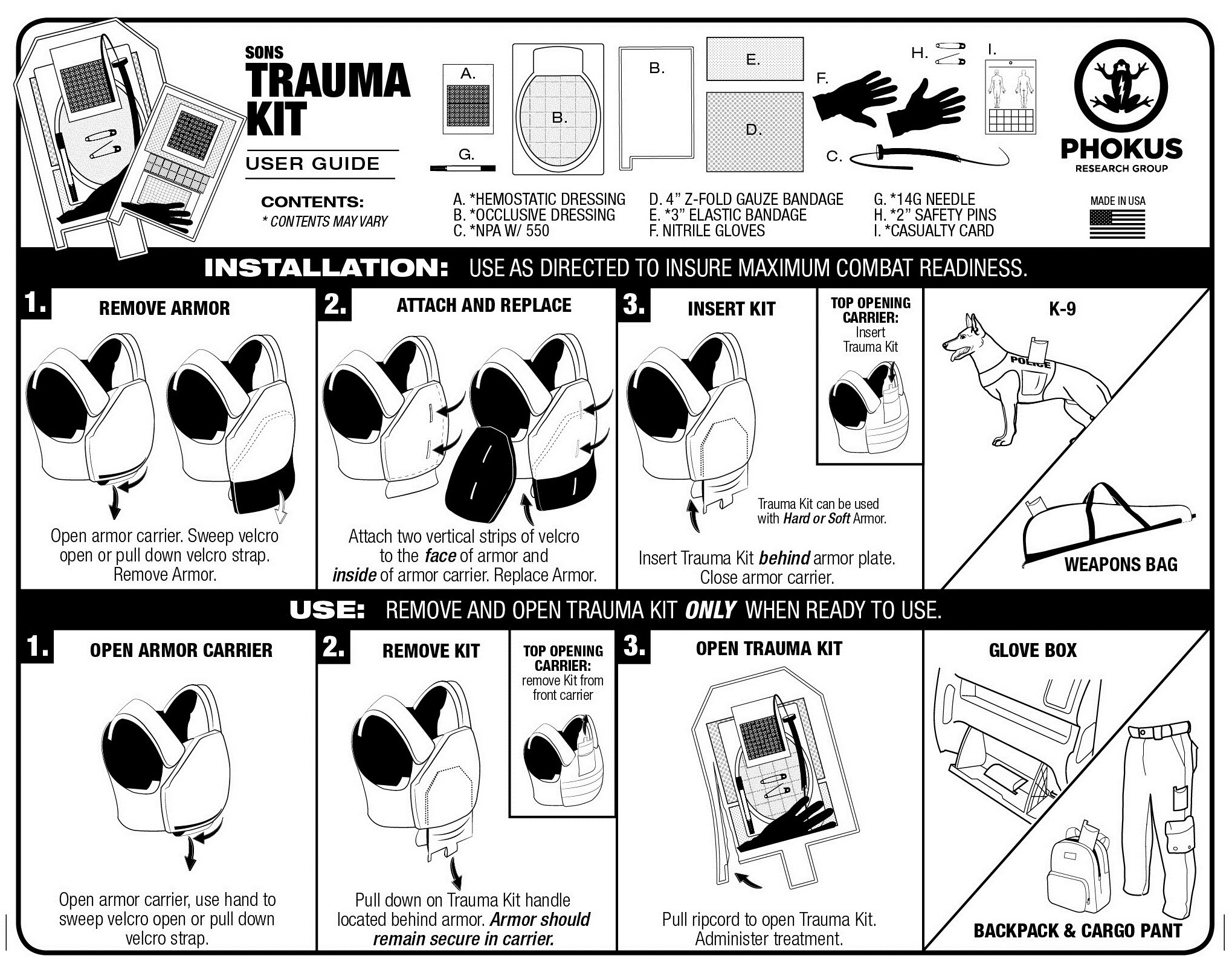 Phokus Research Group has been up to some crafty products for a while, one being their Sons Trauma Kit which offers an interesting alternative to traditional medical blow out kits. Rather than being a kit with a fancy pouch, the kit is shaped flat and slim sitting behind one's armor plate to make a great use of tactical space savings.