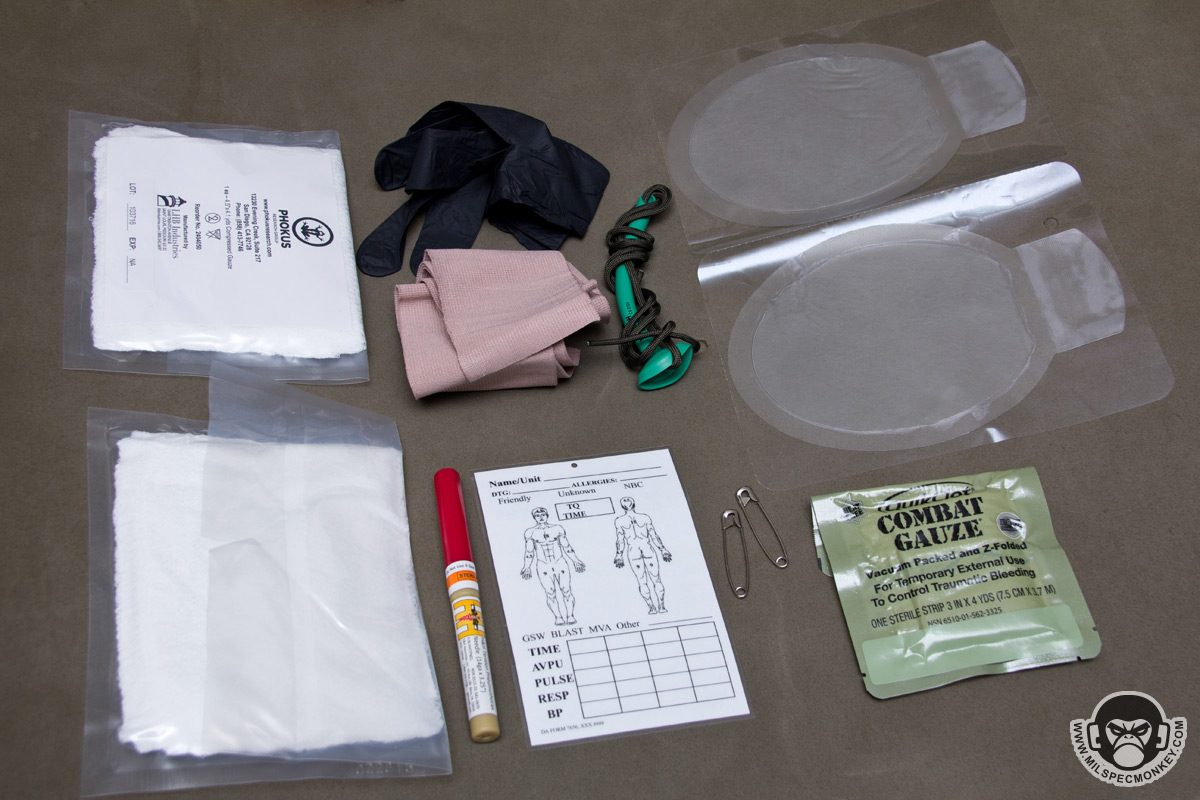 This is a pretty solid setup for stabilizing a gun shot wound and other wounds that are common with tactical dangers. Definitely noteworthy is there is no tourniquet so it appears on this loadout they assume the wearer will have one easily accessible elsewhere on their body. As another small detail the NPA comes wrapped in 550 cord, so you don't have to open any NPA packaging, but one will have to take the 550 cord off it before use.