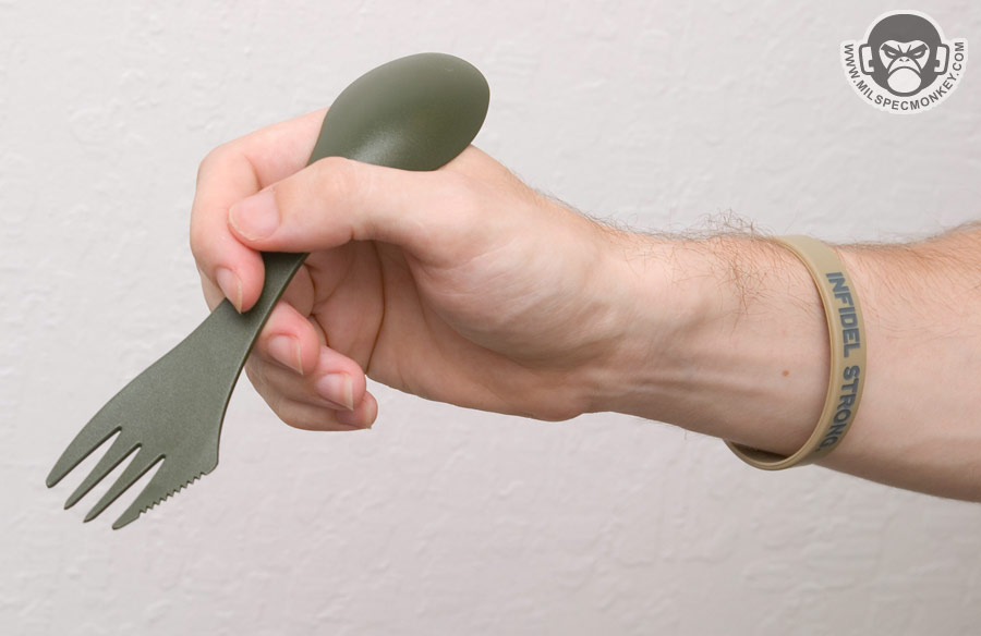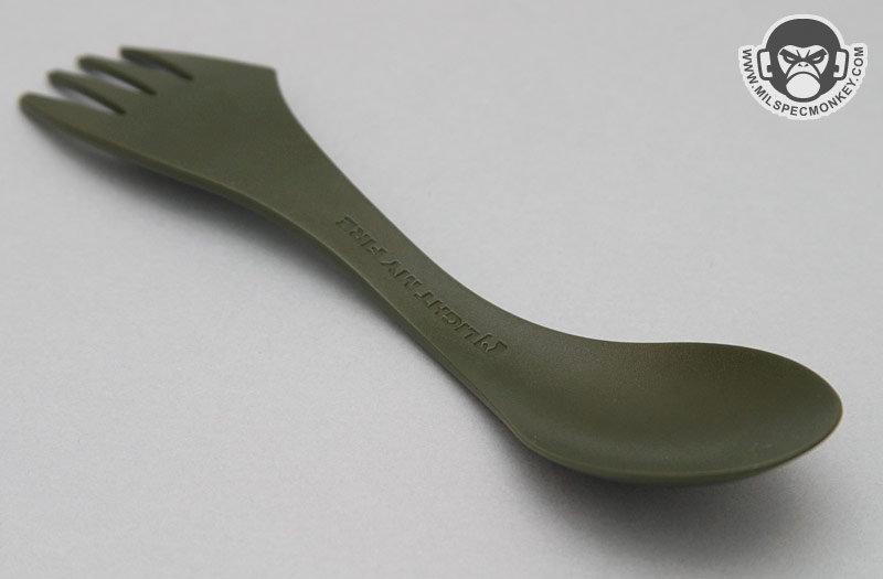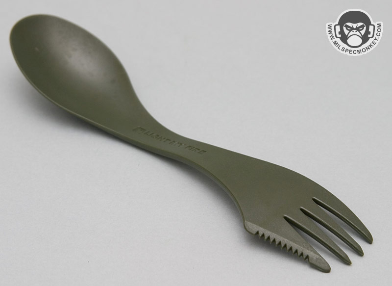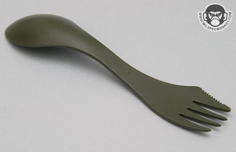 Got a couple of these for amusement around the house and on the move eating. One side is all spoon, and the other side is mostly fork with a serrated knife edge flair. Made from heat resistant Poly Carbonate material, the spork is durable and flexible. It will stay rigid for most uses, but say on ice cream, it will flex a little bit to get the job done. Heat transfer is slow so it is great for hot / boiling liquids. They are dishwasher safe and since not hard metal, are safe to use on fancy cookware with Teflon. The shape isn't good for holding savage "I'm starving" fist style, but works great for the more table manners oriented grip. Advantages of this design is that you get the full effects of utencils. Compared to other sporks, the spoon side is deeper thus can hold more and the fork side has full size prongs to allow poking of thicker foods. The knife part isn't full size, but there is enough serrated area to get your cut on. This 3 in 1 action takes up less space and weight then having 3 separate utencils while still keeping usability. The Super Spork is also very affordable so no drama if you lose one. Multiple military and hi-viz colors are offered, but availability comes and goes.