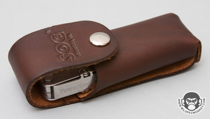 To deploy the handle tools the user needs to lift a cover plate and then unfold out the appropriate tool. Unfortunately usually if you move one tool, the rest will come along for the ride as well. Thus one needs to fully extend the tool they want then make sure all the other tools are folder back into the handle. The Power Lock is a spring loaded metal bar that will lock your tool into place making it ready for use. Now put the handle cover back down and put the SOG into the full folded position if desired. As you may see, this is quite a list of what you need to do to deploy the right tool. To speed things up the handle covers can be removed, but then the grip isn't a comfy. I made sure to lubricate the hinge points, but have not been able to prevent multiple tools coming out together. The screwdriver / awl area doesn't even have staggered thumb grab points so looks like by design SOG just didn't mind the tools move together. It should be noted the PowerLock won't fully lock until all tools and on handle are fully folded or unfolded. To unlock the PowerLock system the user presses down on the back part of the push bar, which is close to the middle of the handle. Now the tools can be moved as desired. Another "meh" aspect to the PowerLock is that it is quite a loose lock. Tools are locked safe, but still have a considerable amount of wiggle in them. For the final oddity the included case is leather, but the instructions say not to store in leather. Additionally the case is too tall so the SOG shakes a lot in there during heavy movement. I guess the not included nylon pouch is the fix for that.