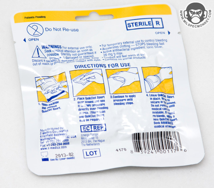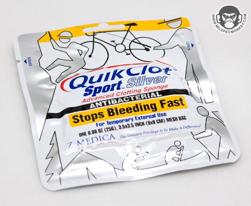 - QuikClot® Sport Silver, 25g Pack - This is the main medical piece of the kit and good for treating a single substantial wound. Works somewhat like a bandage, yet has QuickClot integrated that greatly aids in the speed of clotting to stop bleeding. This variant even has ionic silver for antibacterial qualities.