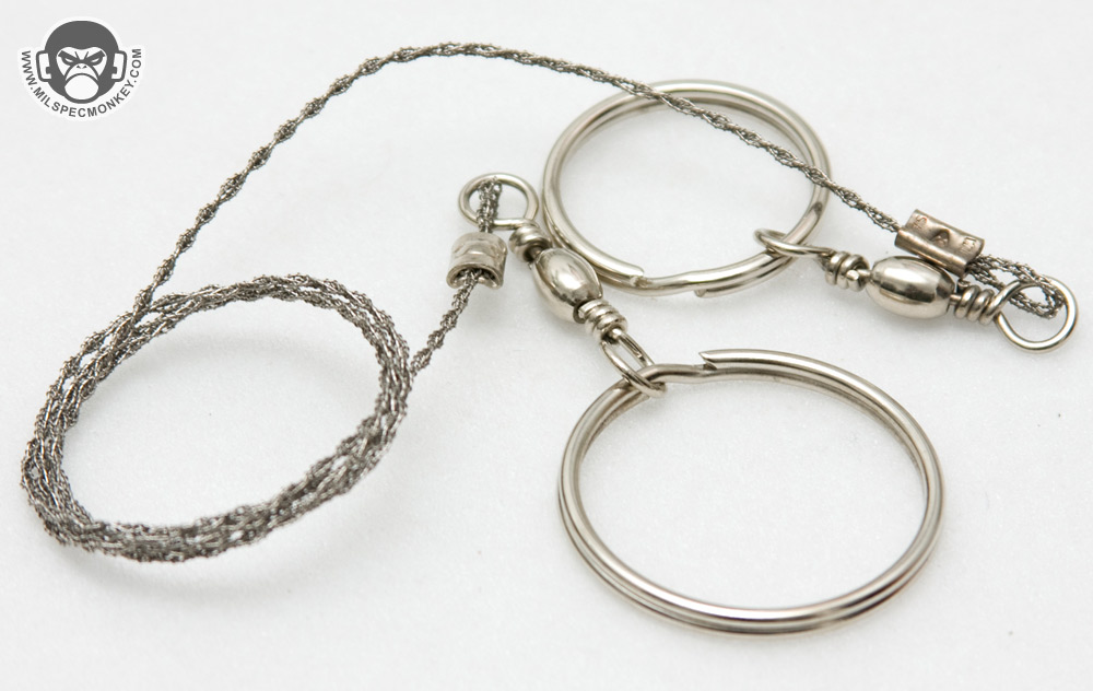 - Survival Saw - This particular version is one of the stronger ones for it's size class. No parts on it are actually sharp, but it can cut the hell out of wood. A nice feature is that the rings are sized differently so a snare can easily be constructed with incorporated swivels to make operation much easier. I learned the hard way the sawing motion is much more sidal rather than wrapping fully around as a wrap which will result in a lot more snagging than sawing.