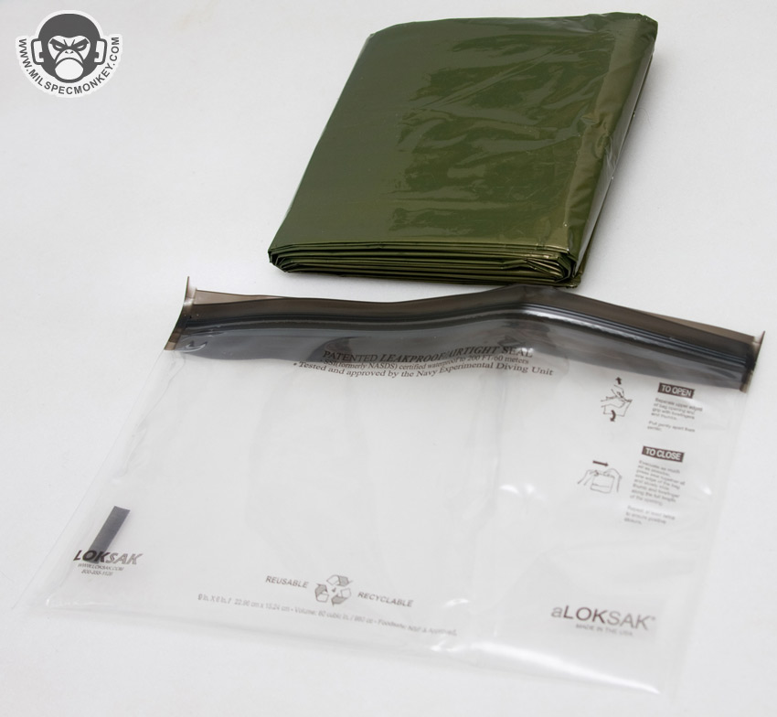 - Aloksak 9"x6" Waterproof Bag (980cc) - Since almost a liter this makes for a great fit with the Aquamira tablets. Rather than some generic sandwich ziplock, the Aloksak allows water to be stored safely while going through terribly nasty swamps and other harsh environments. Common ziplock bags can be contaminated by porus migration while the Aloksak will not.