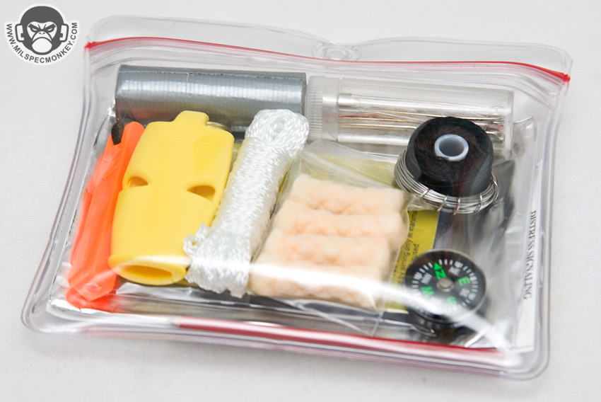 The foundation of the kit is based on the Pocket Survival Pak which is an existing civilian survival kit so it has pluses and minuses. The main minus is that the colors are bright with hope of being seen rather than military colors were earthy tones are preferred for evading. On the plus side, since the pack has been around it helps keep the cost down and has had time to be proven useful. A lot of stuff is inside so I'm going to switch over to more of a list format. The whole pak comes inside a waterproof clear ziplock style sealing bag.