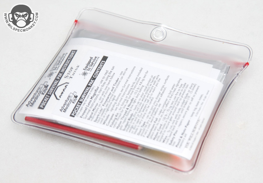 - Pencil and Waterproof Note Paper [2 pcs.] - The pencil is super small and compact, yet functional and can be sharpened with the scalpel. Paper allows for note taking such as maps, logs, or other documentation.