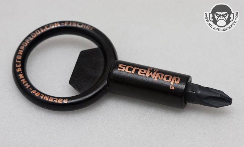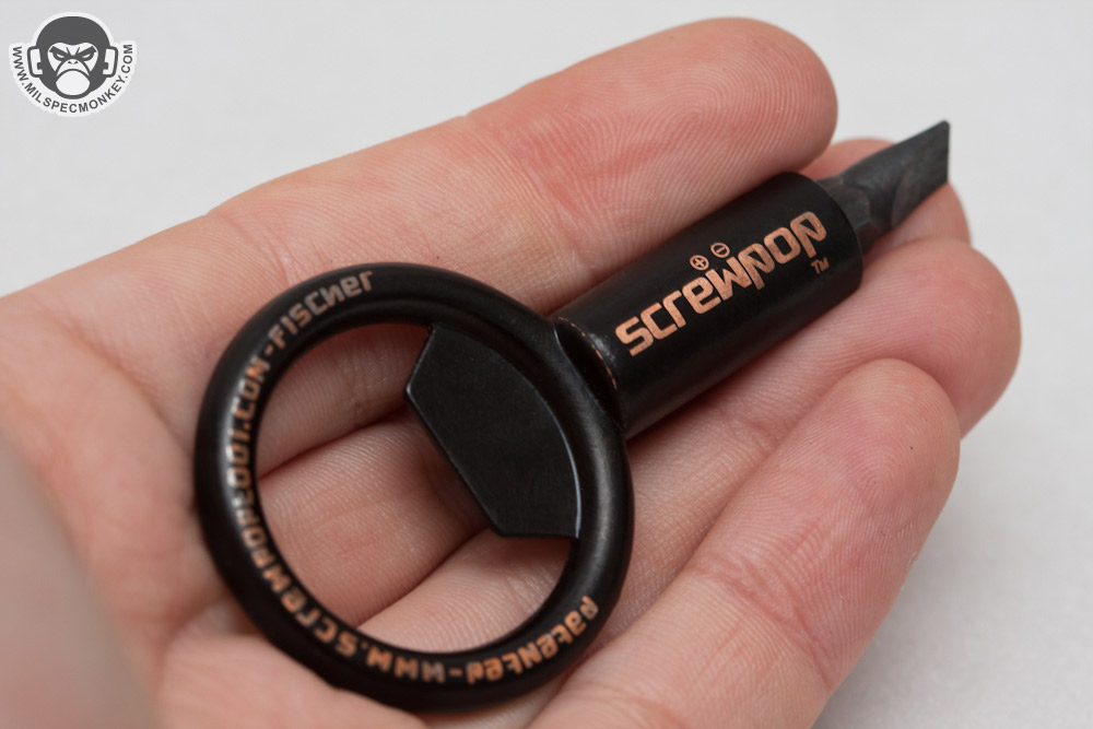 I don't really open a lot of bottles, but the ring based design of the bottle opening part is classic based and functional. Since the ring is rounded rather than flat, it offers a smooth up rotation motion when actually popping off a bottle top. The ring area is also the preferred keychain connection point. If one were to milk further uses, it could be a last ditch defense tool; having the ring lay inside the hand with the driver portion sticking out between fingers when gripped in a fist. Not exactly as handy as a knife in a fight, but I certainly wouldn't want to get clocked with a Screwpop in the head. As you hopefully see in the pics, at about a 3" x 1-3/8" size footprint, the Screwpop is fairly compact. Since there is only one technical moving part, durability is increased compared to more complex keytool designs. The Screwpop weight is within reason so even though the bit ends may look scarry to your pockets well being, they are no worse than the edges a normal set of keys create. If being picky, I'd say having the Phillips head side of the bit exposed is more pocket friendly.