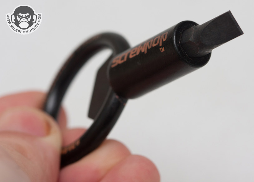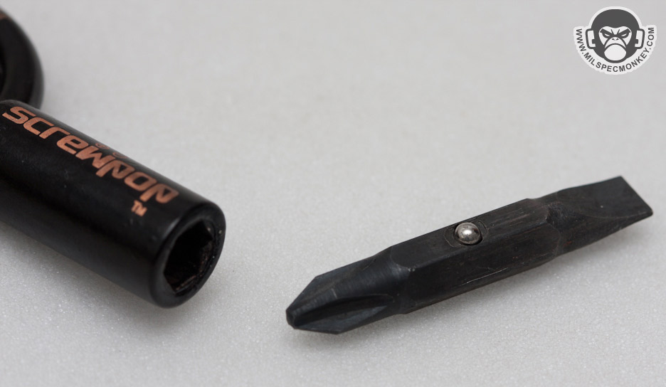 Here is a lil something for the EDC crowd. There are a lot of cool guy bottle openers out there, but Screwpop found a good way to integrate further functionality. The end holds a custom double sided screwdriver bit (Phillips #2/Flat Head #2) which in daily urban life is one of the most common used tools. I haven't had a chance to confirm, but the bit holding area is supposed to work as a 1/4” Hex Nut Driver as well. Chances are slim you'll use that part, however it is better than having some other crazy connection system that won't work for anything else. The bit is held in place by a spring loaded ball, which is sufficient for a hold. The bit grip will feel low to some, but it won't shake out and the bit can be manually pulled out without much hassle. Perhaps a magnet could be added for extra piece of mind, but appears it would be unnecessary at the end of the day and add to cost. The bit sizing is a little off compared to traditional 1/4" hex bits so the ones I tried from separate bit sets were too big and would only insert slightly in.