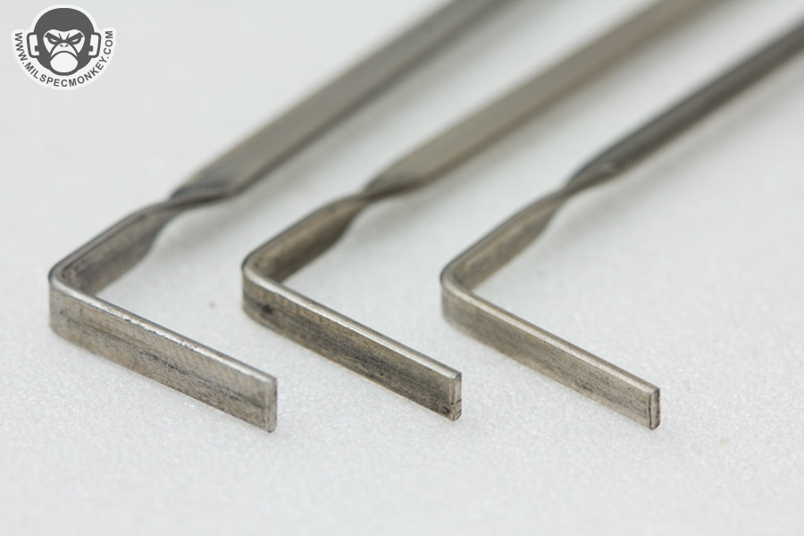 The tension wrenches mostly vary by sizing, but 3 are twisted for comfort while the other 3 are double sided to offer more length options. The varied width is crucial for varied keyhole sizes and then having additional short tension ends comes in handy when dealing in small locks. How far the tension bar is inserted and which one is used can adjust the tension feel to assist the operator's needs.