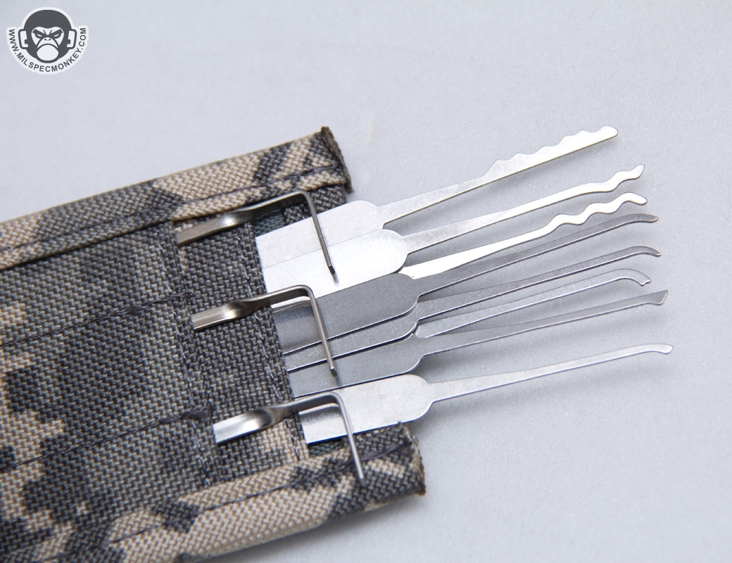 With this lineup you get the go-to rake tools along with the expanded hook selection to be able to really get in there and do detail work on pesky locks. For those wearing kit and rocking locks on the job, the Sentry set can really help on saving time and encumbrance to complete the mission safely. Currently available in ACU and Coyote pouch colors.