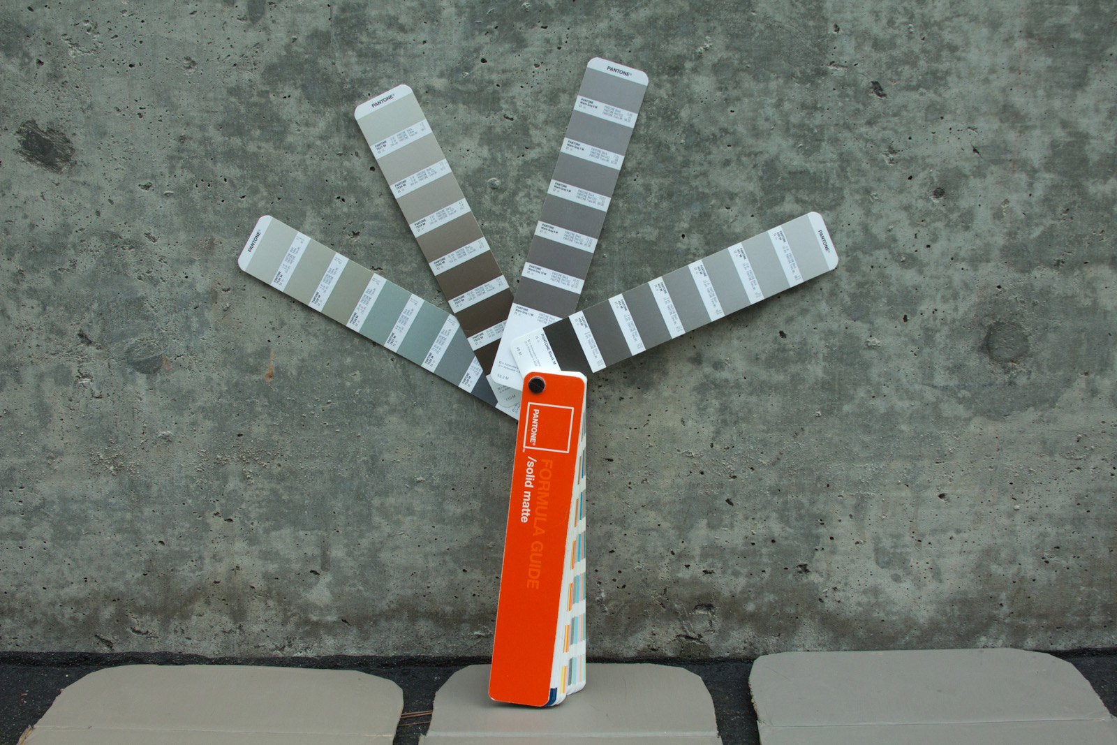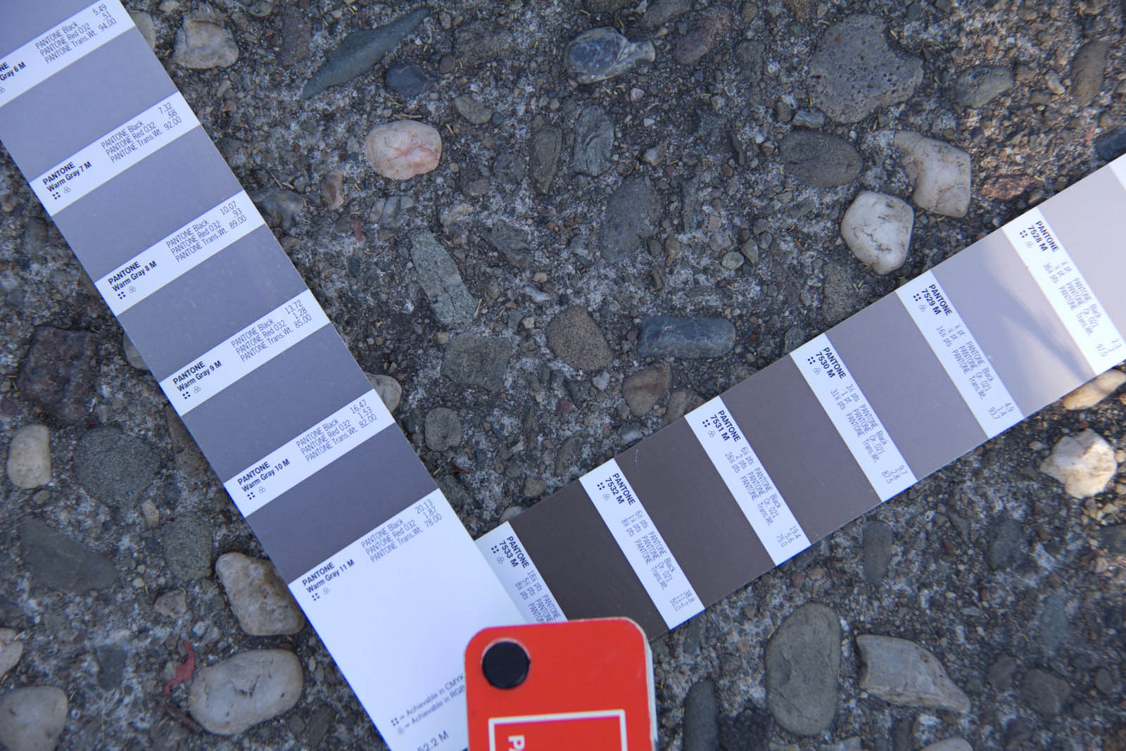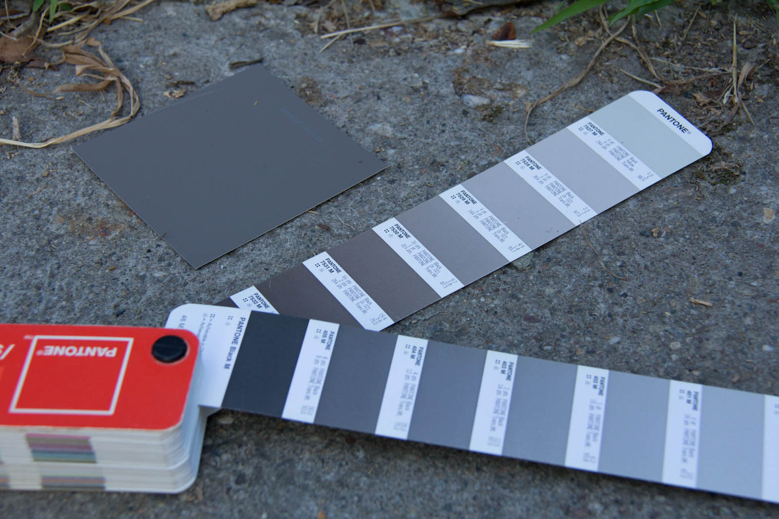 So to get started I whipped out the ol' Pantone book, turns out despite all the crap I was getting for warm greys, they are still actually a little more cool than most my medium concrete tests. I looked around at some other nearby grey pages, but eventually found that color 7531 was matching things more often. When it came to cooler concrete colors, color 405 came in handy, which is actually a neutral grey. There can be quite the spread of urban color from light grey sidewalks, medium concrete, old asphalt, to even super black fresh asphalt so the goal is try and aim for the middle.