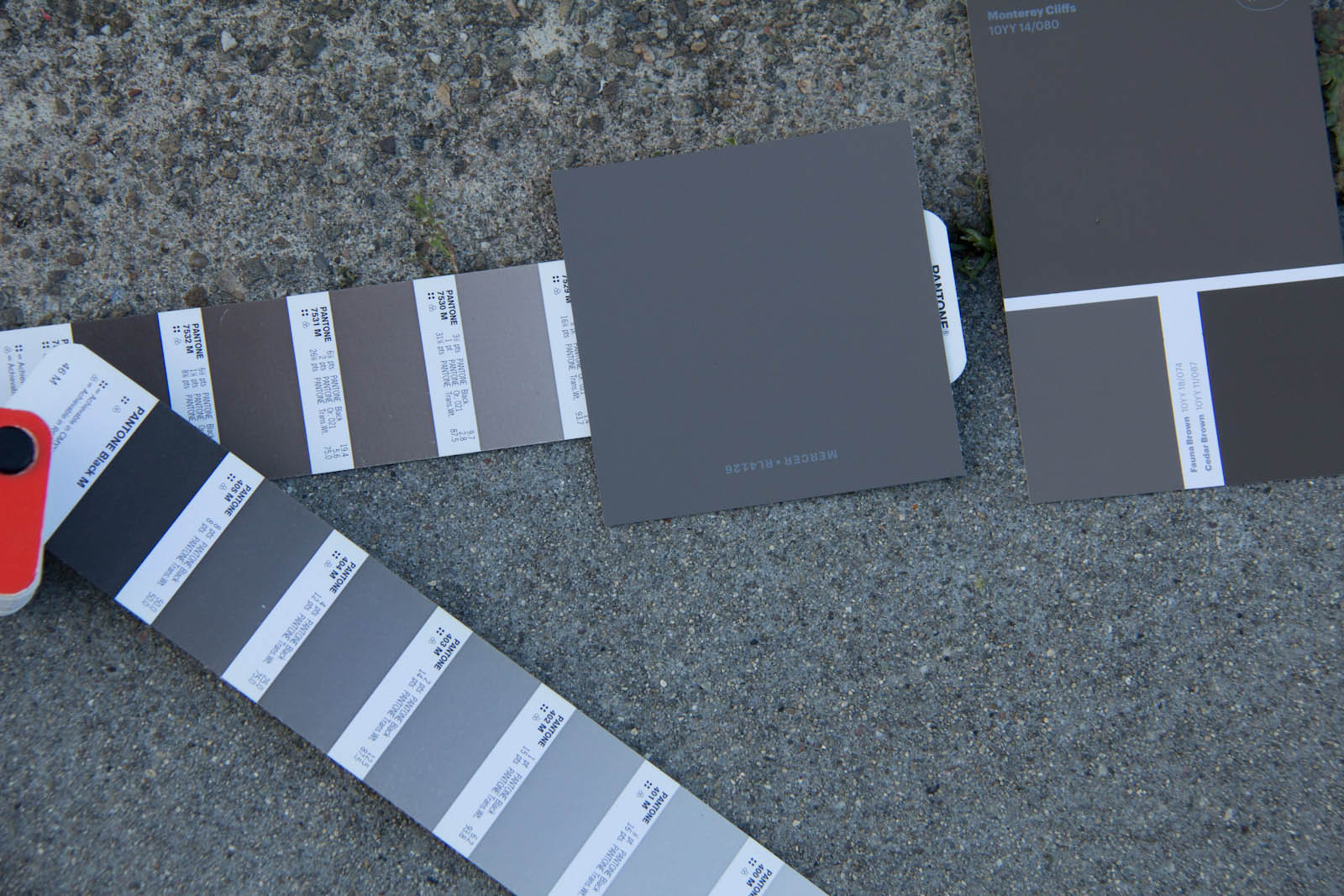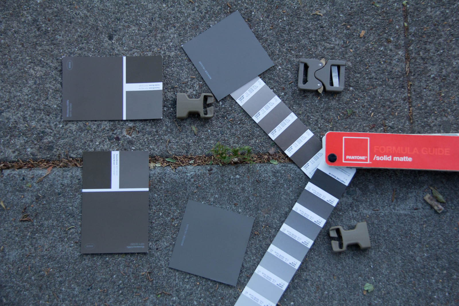 To expand my colors a bit and offer an easy way for others to get samples, I went on down to Home Depot to score some color cards. After more trial and error I was able to narrow things down to Fauna Brown 10YY 18/074 as seen on Glidden sample card WN26, this color happens to be very close to Elephant Grey as seen on recent Cobra Buckles. Additionally I found Mercer RL4126 from Ralph Lauren Paint cards at Home Depot to still be in the ballpark and to be more desaturated, thus looking closer to what people expect out of a grey. General observations from research so far in my area: