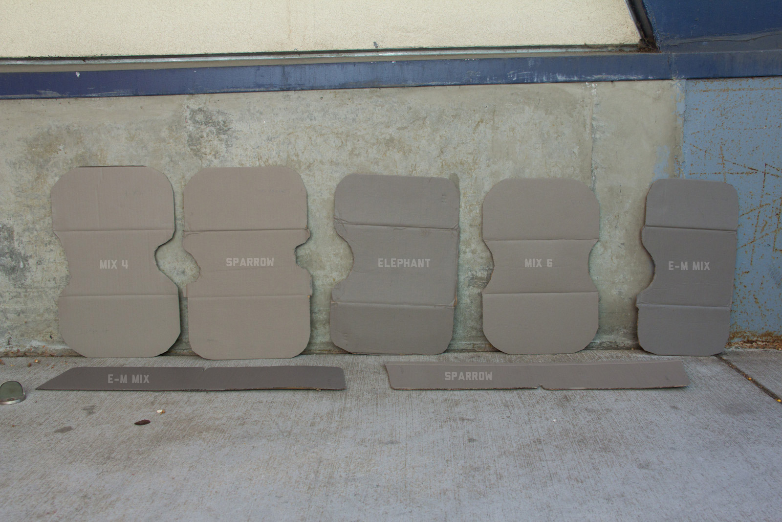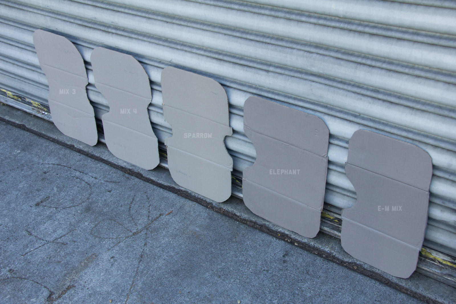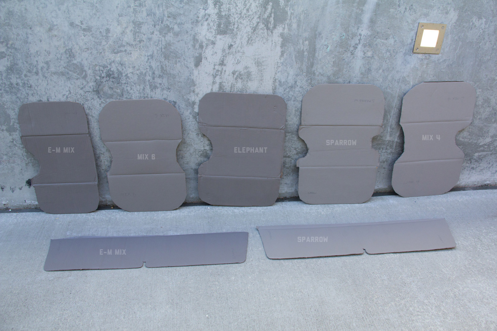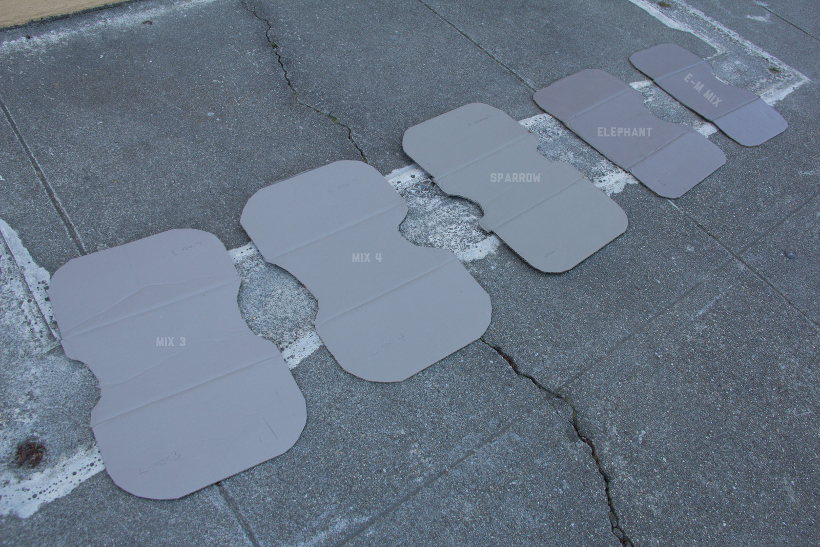 After a lot of back and forth on mixing and documenting, I narrowed things down to Elephant/Fauna, Mix6, Sparrow, and Mix4. The differences were getting pretty darn subtle which perhaps is a sign of good progress. Elephant leans towards the darker side, and although a smidge too much red it still looks good in a lot of places. Mix6 seems like a solid middle ground so far on the concrete spectrum, yet is still brighter than most tac colors in use. Going a little more light, sparrow also is in the middle zone and the slight green usually does more good than bad. Then finally Mix4 leans on the lighter end as a good neutral color, which of course makes it more susceptible to contrasting on darker colors.