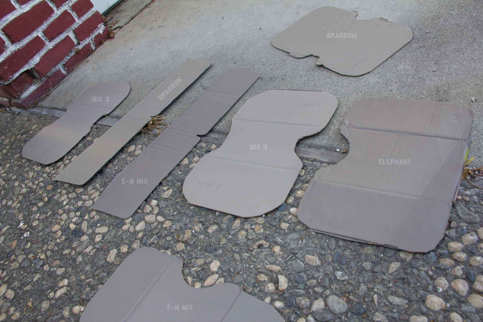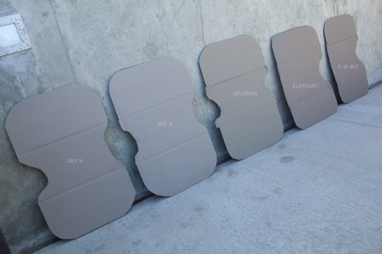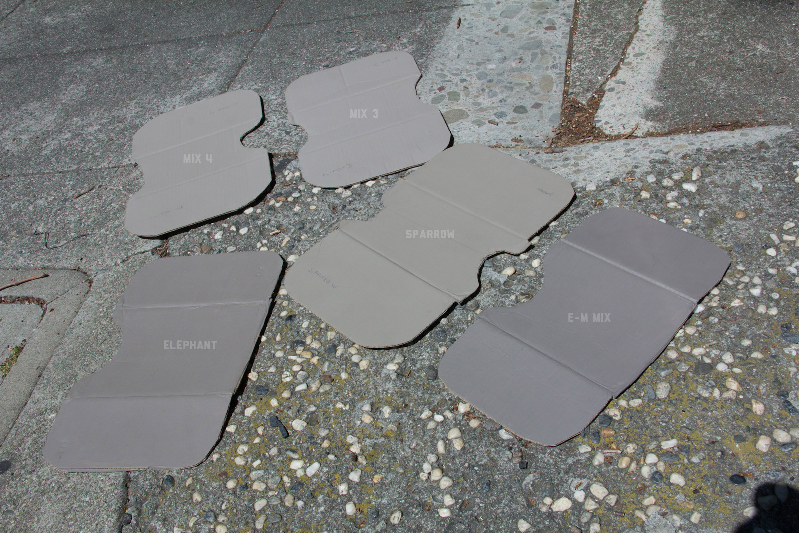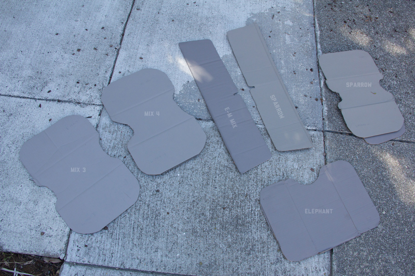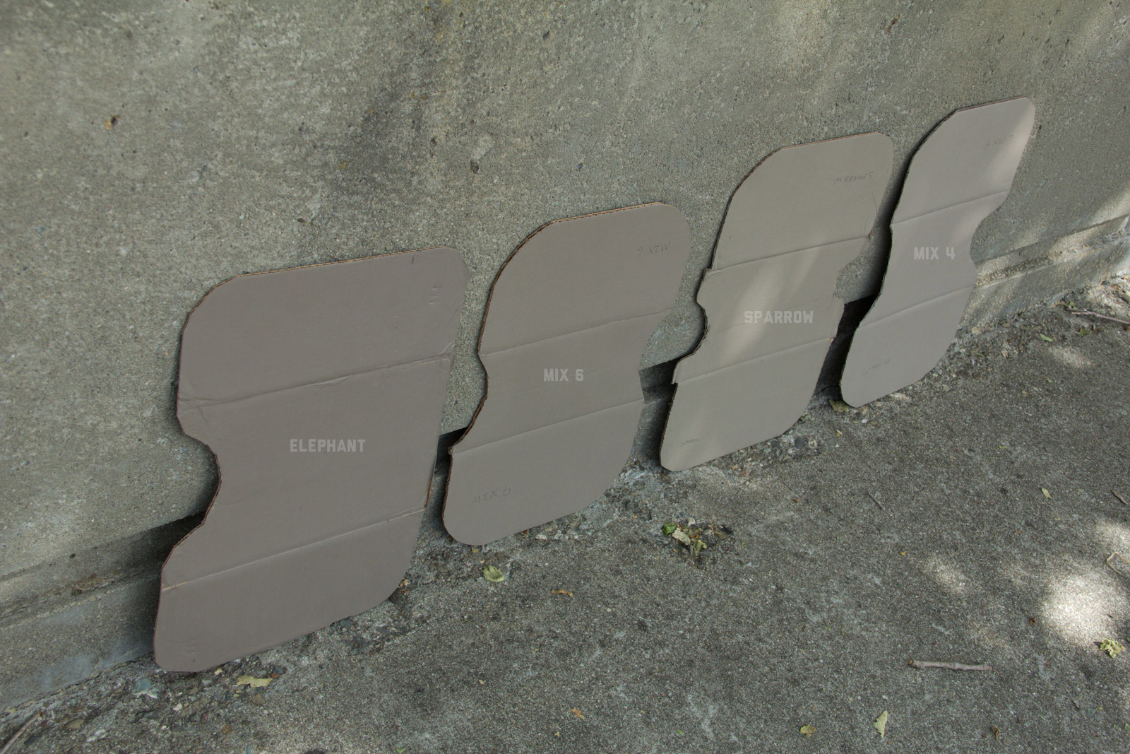 After a lot of back and forth on mixing and documenting, I narrowed things down to Elephant/Fauna, Mix6, Sparrow, and Mix4. The differences were getting pretty darn subtle which perhaps is a sign of good progress. Elephant leans towards the darker side, and although a smidge too much red it still looks good in a lot of places. Mix6 seems like a solid middle ground so far on the concrete spectrum, yet is still brighter than most tac colors in use. Going a little more light, sparrow also is in the middle zone and the slight green usually does more good than bad. Then finally Mix4 leans on the lighter end as a good neutral color, which of course makes it more susceptible to contrasting on darker colors.