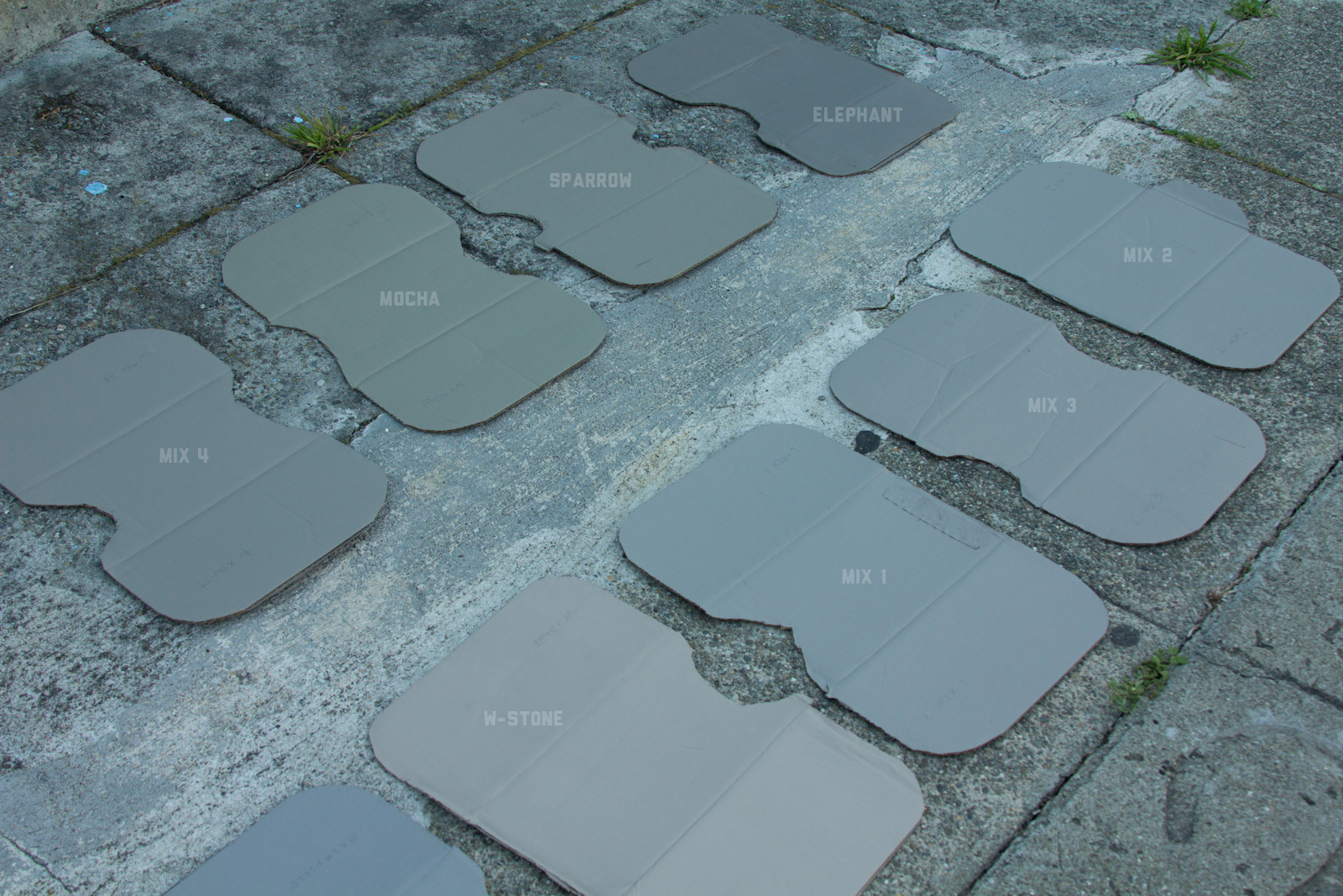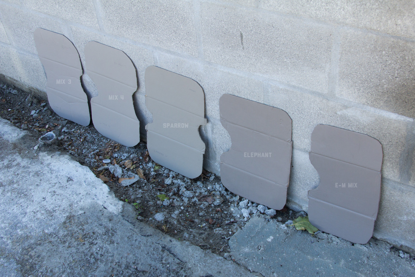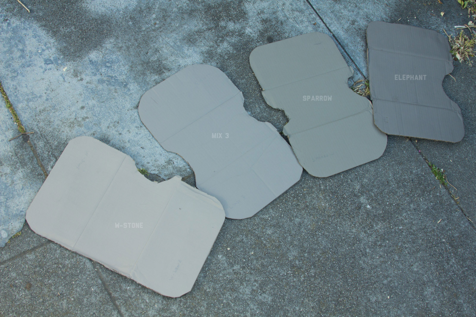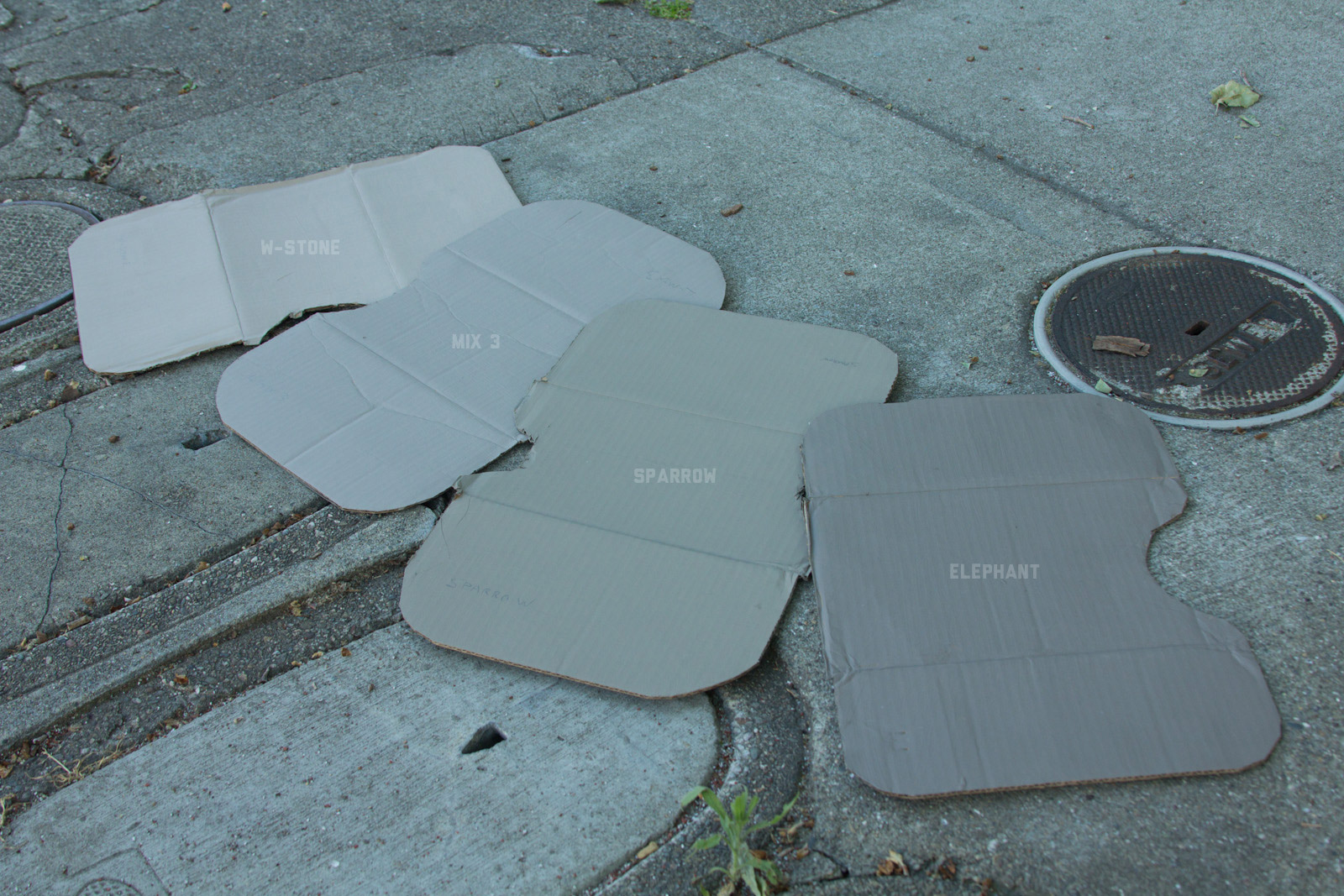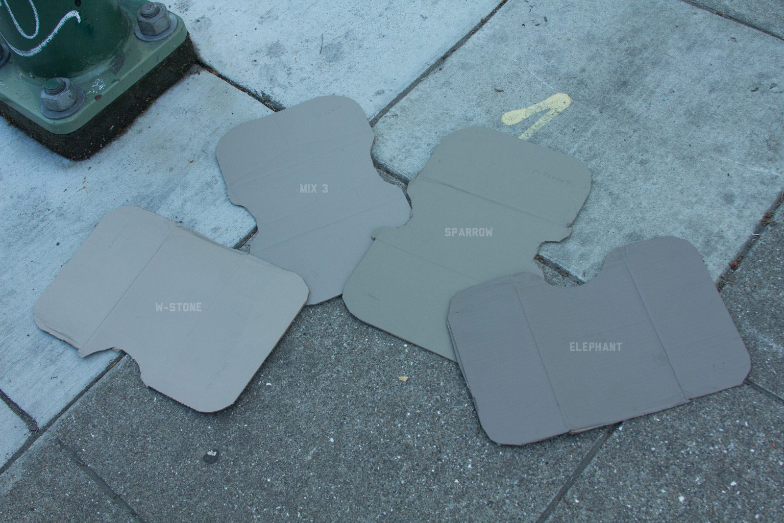 After some good feedback on this article I took the advice to try and investigate more concrete walls. As it turns out, most unpainted walls in my area are wicked bright, Pantone wise coming in around: 402 - 403, 7529 - 7530, WarmGrey 6 - WarmGrey 8, 7536 (on lighter end). I had my doubts hearing Crocodile (basically a desert tan) was being used in urban night ops, but after testing some lighter walls this made more sense. Based on this I got Wright Stone Tan 10YY 30/106 - card WN25 Glidden at Home Depot to add some lighter options to my testing. Instead of just small samples I also moved on to larger samples by painting cardboard chunks. For a more middle tone for my pile I also picked up Sparrow AF-720 by Benjamin Moore along with Brimfield RL4352 Ralph Lauren Paint, mostly as a light grey to mix with. By this time I dropped Mercer for looking too cool on most tests and in a bigger size the Fauna/Elephant had a little too much red, but was still good enough to keep around. Since Wright Stone Tan was going to be too rowdy on its own, I ended up with Mix4 for lighter end testing for a while. Despite enjoying sparrow for a light middle, it was showing just a little more green than wanted so after a couple more mixes I found Mix6 to be a nice result, being the middle of Elephant and Sparrow. I briefly tried Mocha, a color that looked good on the sample card, but with testing ended up pretty green.