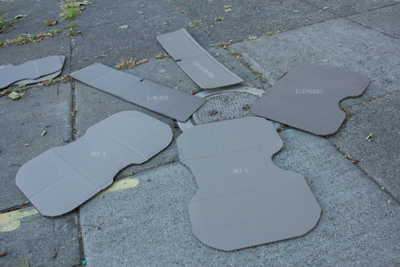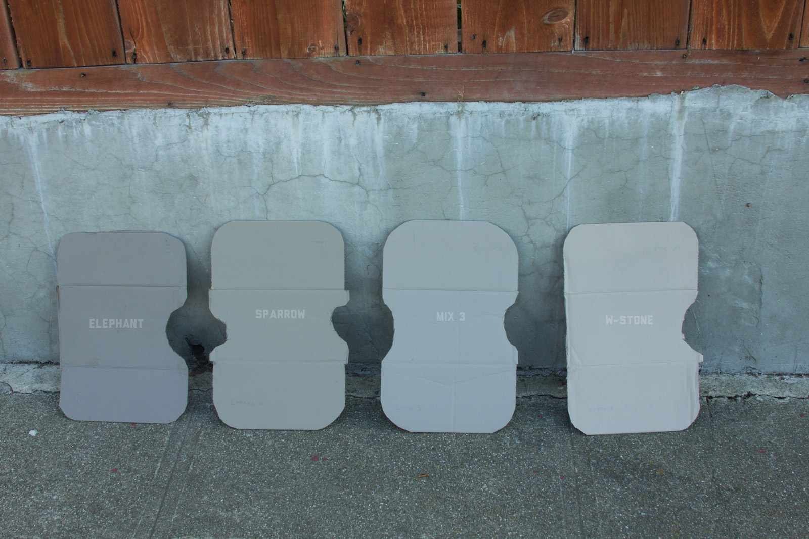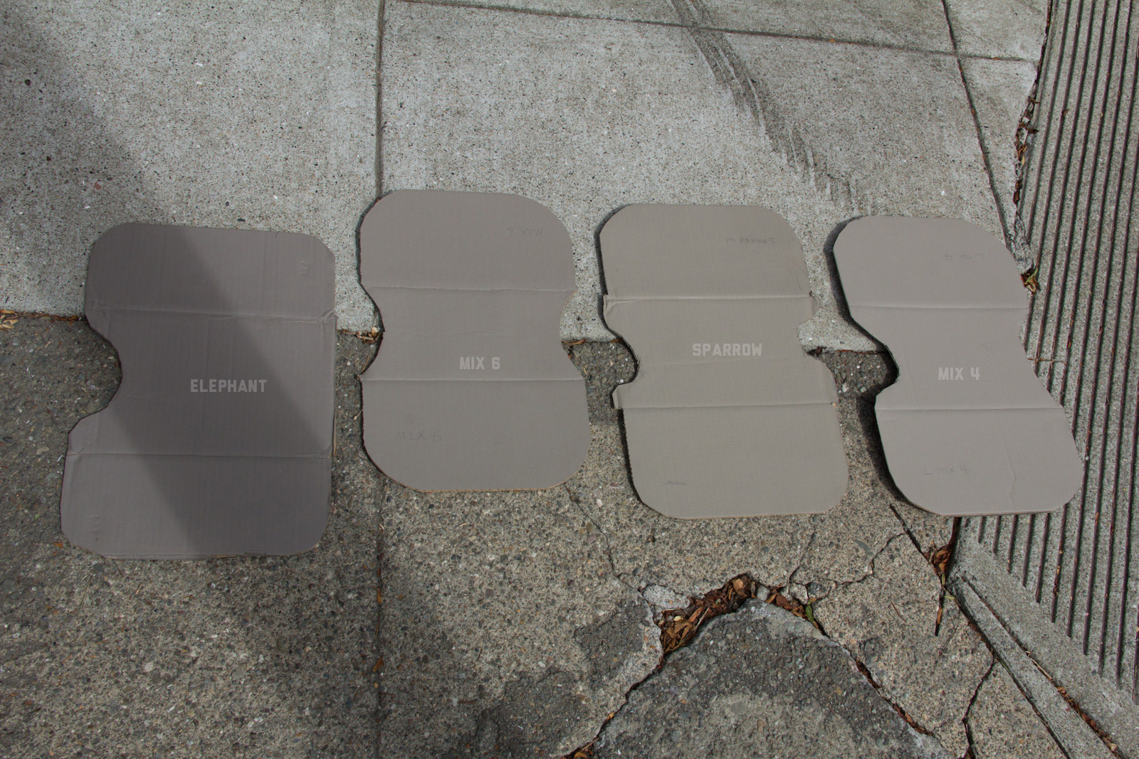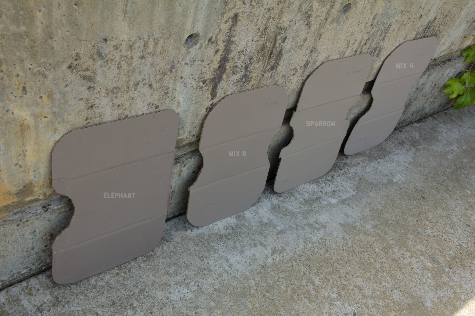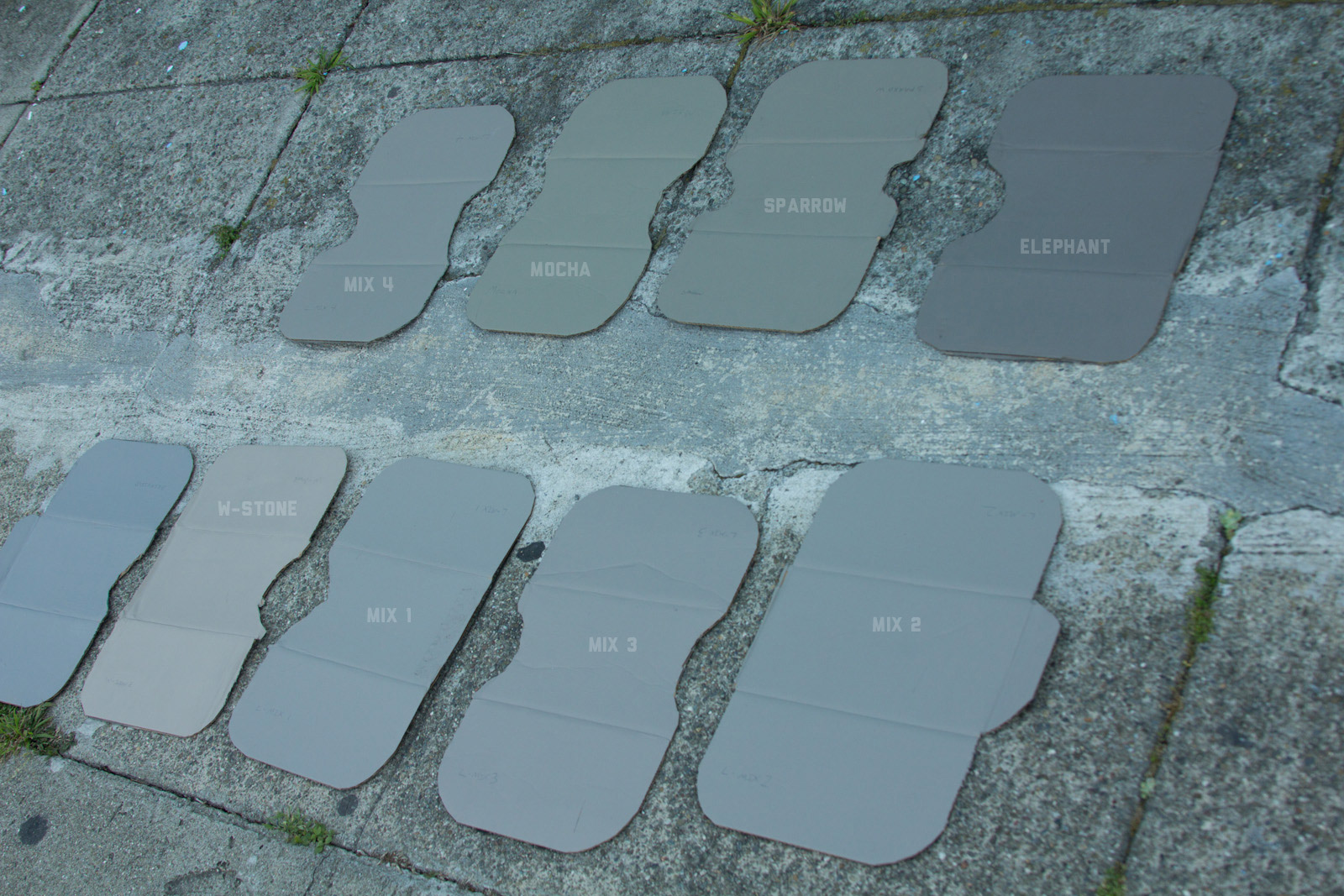 After some good feedback on this article I took the advice to try and investigate more concrete walls. As it turns out, most unpainted walls in my area are wicked bright, Pantone wise coming in around: 402 - 403, 7529 - 7530, WarmGrey 6 - WarmGrey 8, 7536 (on lighter end). I had my doubts hearing Crocodile (basically a desert tan) was being used in urban night ops, but after testing some lighter walls this made more sense. Based on this I got Wright Stone Tan 10YY 30/106 - card WN25 Glidden at Home Depot to add some lighter options to my testing. Instead of just small samples I also moved on to larger samples by painting cardboard chunks. For a more middle tone for my pile I also picked up Sparrow AF-720 by Benjamin Moore along with Brimfield RL4352 Ralph Lauren Paint, mostly as a light grey to mix with. By this time I dropped Mercer for looking too cool on most tests and in a bigger size the Fauna/Elephant had a little too much red, but was still good enough to keep around. Since Wright Stone Tan was going to be too rowdy on its own, I ended up with Mix4 for lighter end testing for a while. Despite enjoying sparrow for a light middle, it was showing just a little more green than wanted so after a couple more mixes I found Mix6 to be a nice result, being the middle of Elephant and Sparrow. I briefly tried Mocha, a color that looked good on the sample card, but with testing ended up pretty green.
