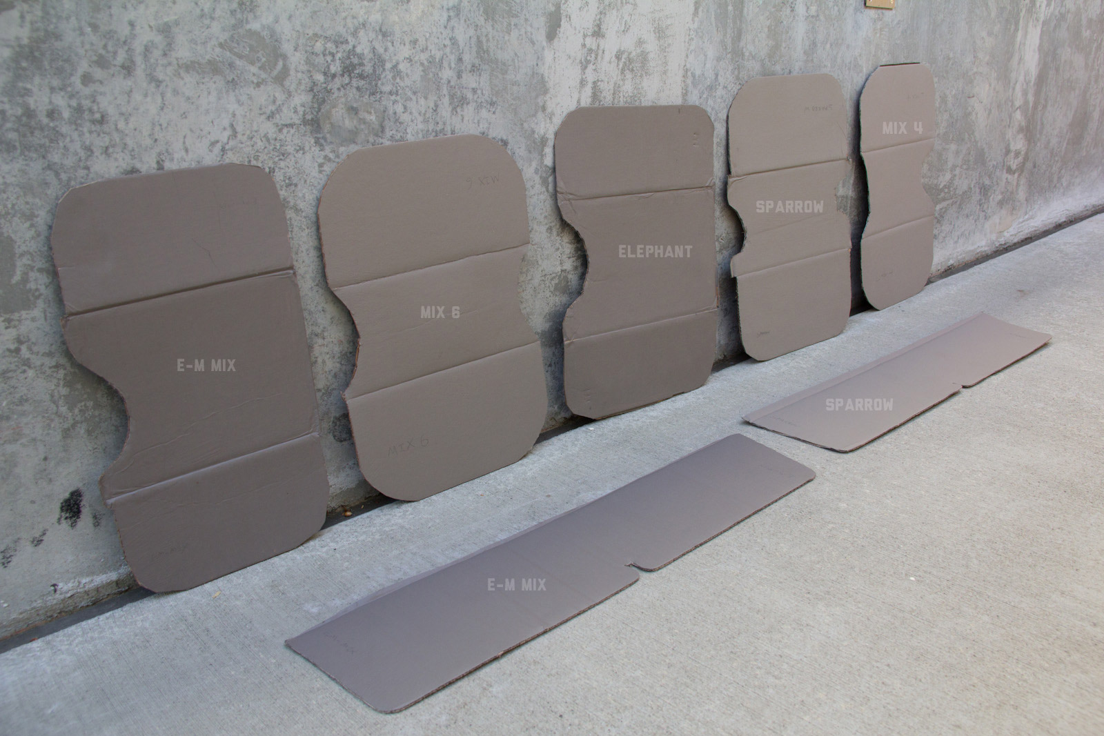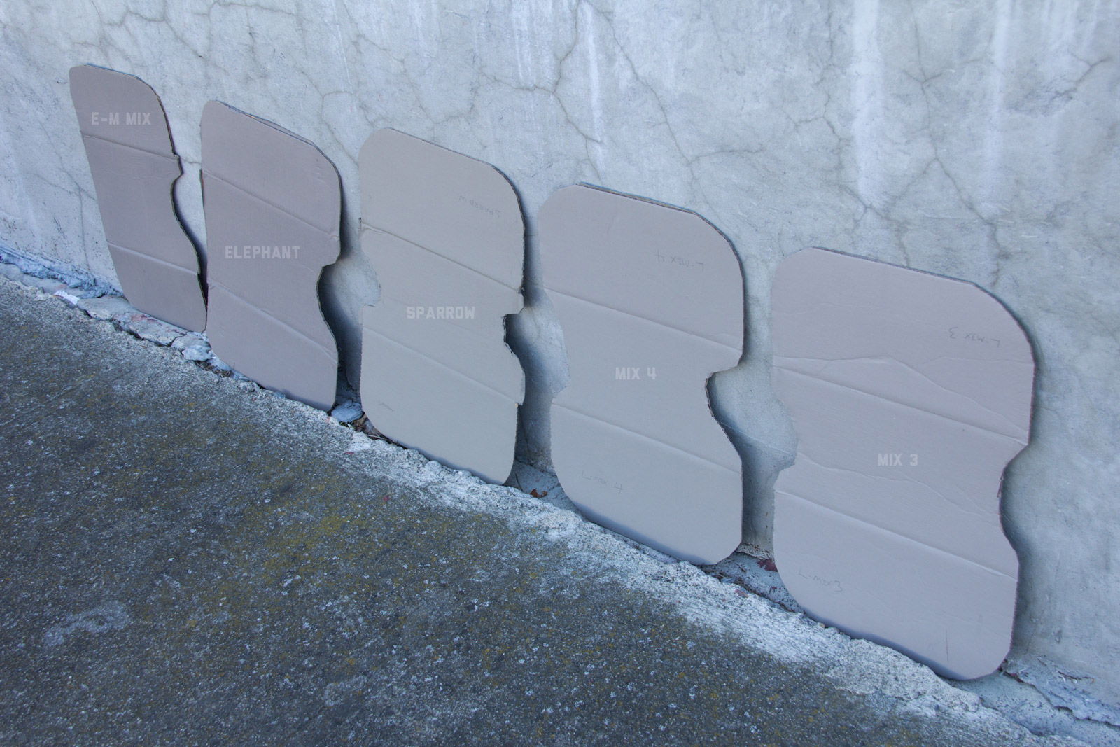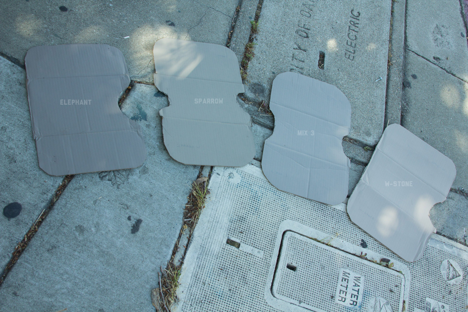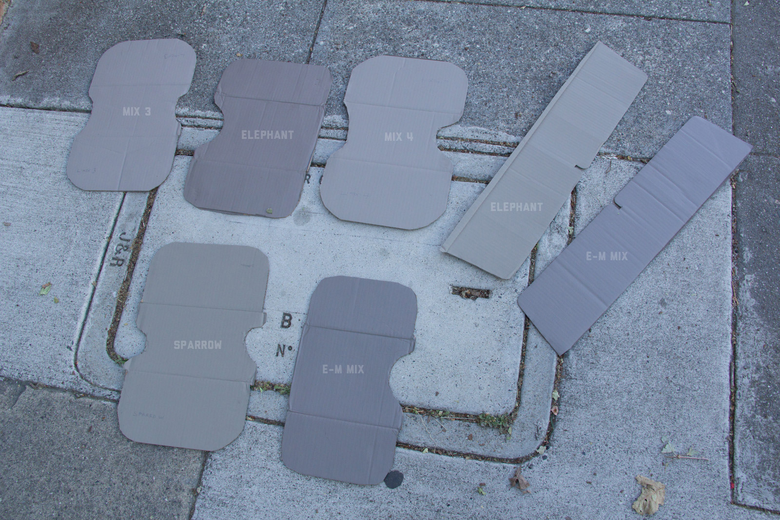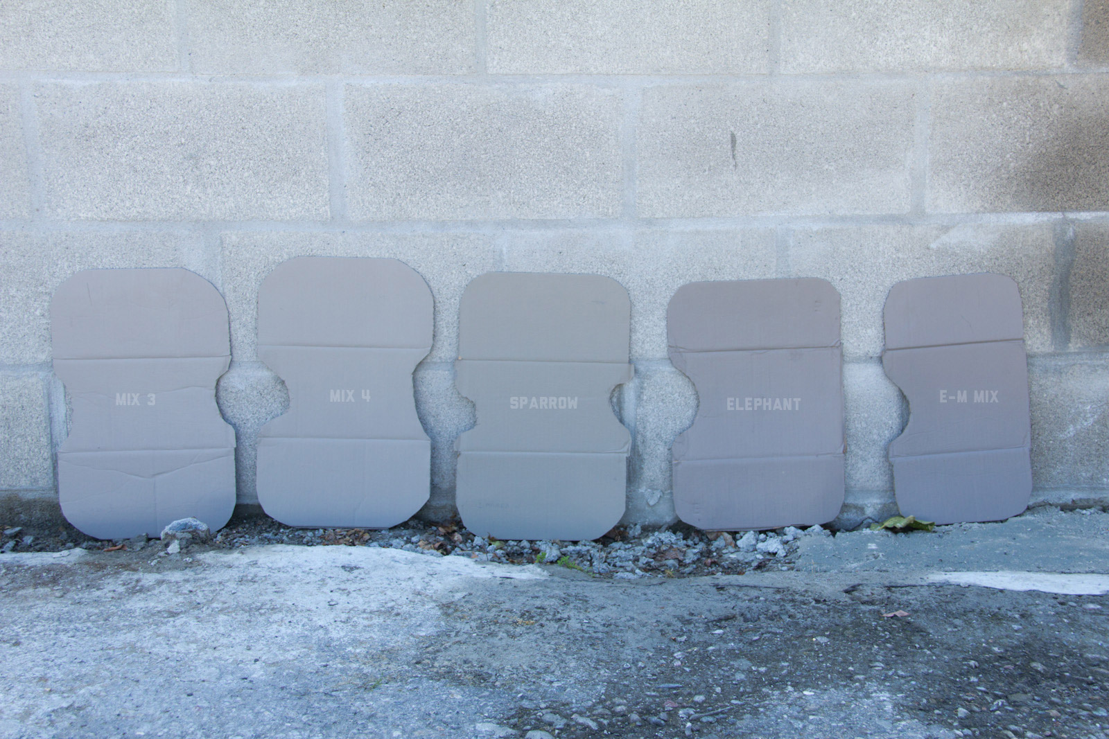 After some good feedback on this article I took the advice to try and investigate more concrete walls. As it turns out, most unpainted walls in my area are wicked bright, Pantone wise coming in around: 402 - 403, 7529 - 7530, WarmGrey 6 - WarmGrey 8, 7536 (on lighter end). I had my doubts hearing Crocodile (basically a desert tan) was being used in urban night ops, but after testing some lighter walls this made more sense. Based on this I got Wright Stone Tan 10YY 30/106 - card WN25 Glidden at Home Depot to add some lighter options to my testing. Instead of just small samples I also moved on to larger samples by painting cardboard chunks. For a more middle tone for my pile I also picked up Sparrow AF-720 by Benjamin Moore along with Brimfield RL4352 Ralph Lauren Paint, mostly as a light grey to mix with. By this time I dropped Mercer for looking too cool on most tests and in a bigger size the Fauna/Elephant had a little too much red, but was still good enough to keep around. Since Wright Stone Tan was going to be too rowdy on its own, I ended up with Mix4 for lighter end testing for a while. Despite enjoying sparrow for a light middle, it was showing just a little more green than wanted so after a couple more mixes I found Mix6 to be a nice result, being the middle of Elephant and Sparrow. I briefly tried Mocha, a color that looked good on the sample card, but with testing ended up pretty green.