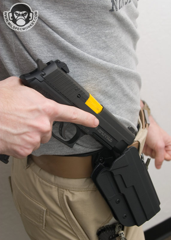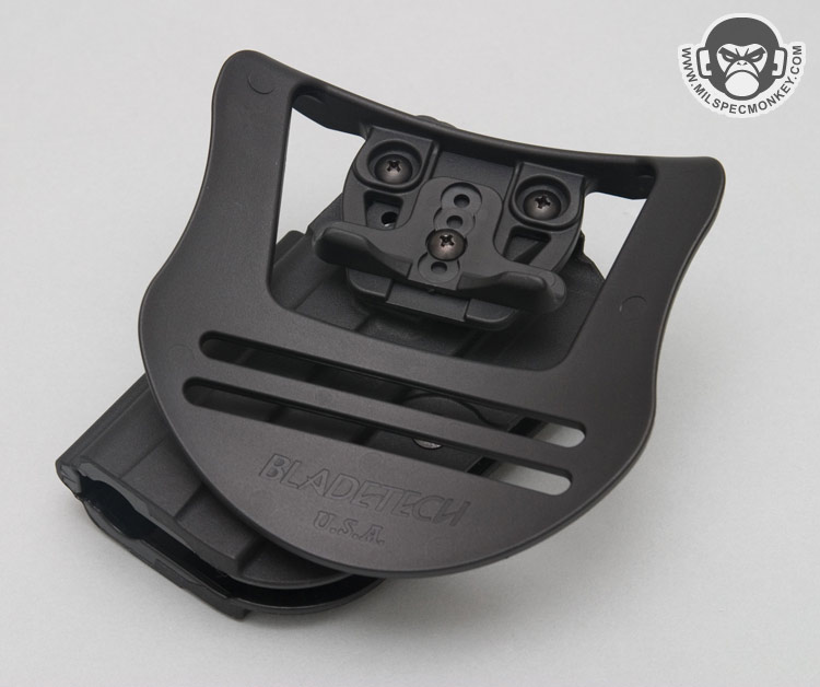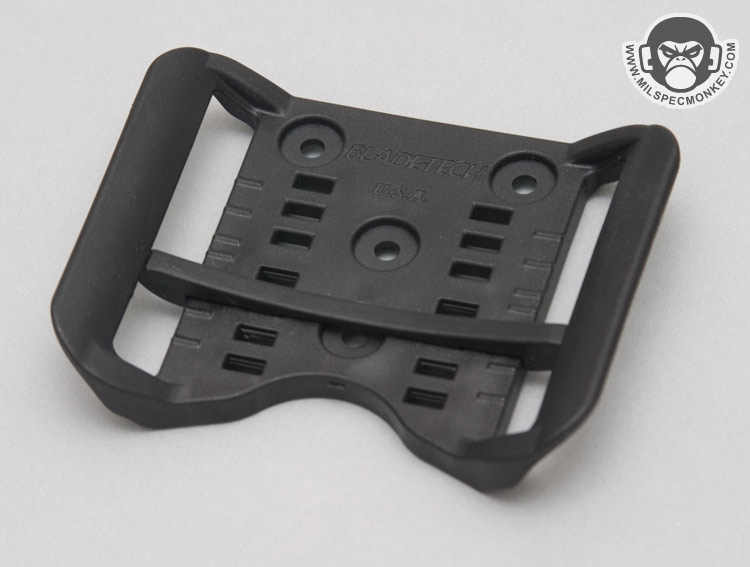 5.11 teamed up with Blade-tech to offer their proprietary blend of polymers holster. Upon first glance it appears to just be a Kydex type holster, however the materials used allow the Revolution to be much more temperature resistant. Thus it will not get soft in hot areas or brittle in extreme cold. The surface is overall slick keeping gun wear to a minimum.