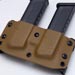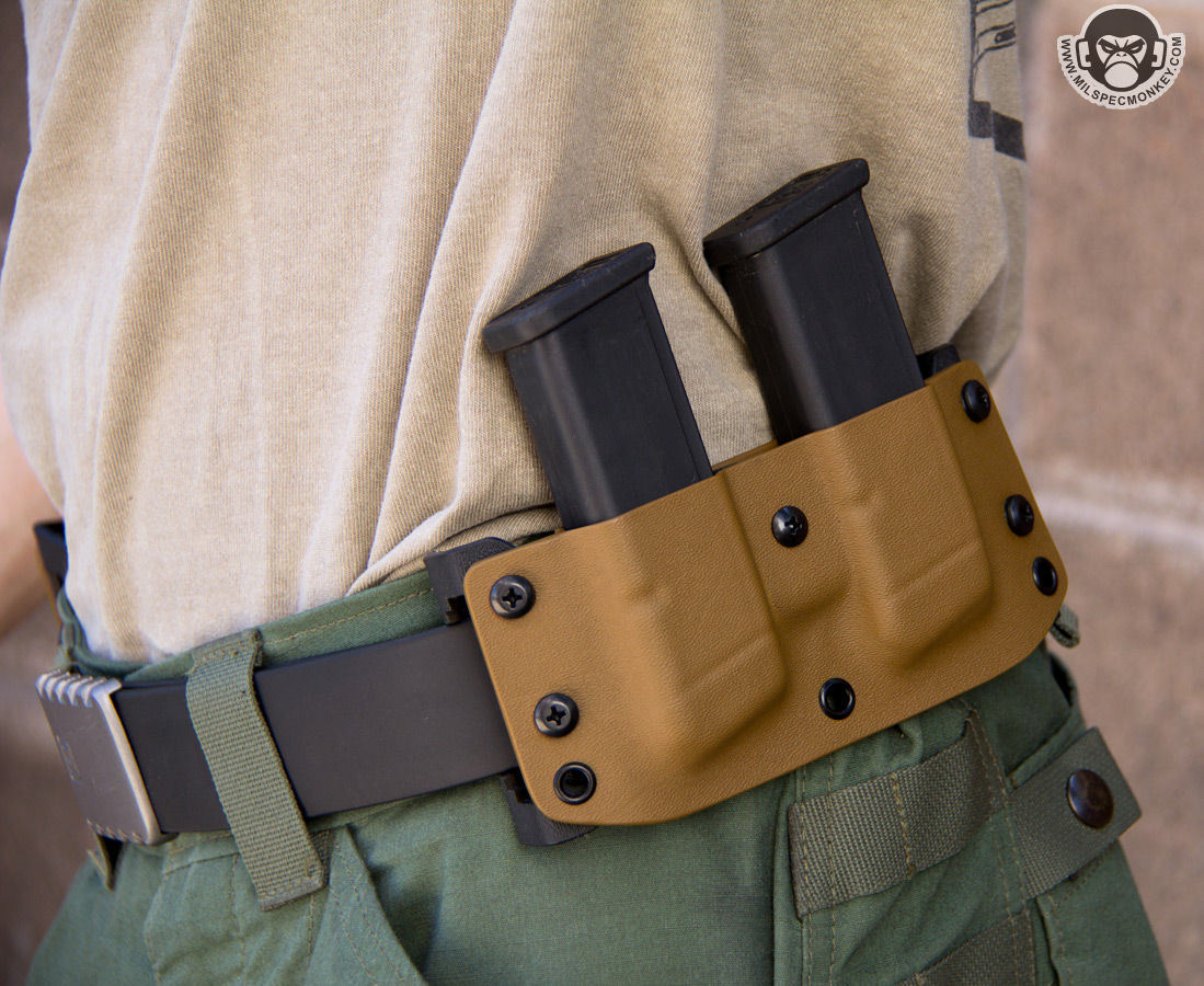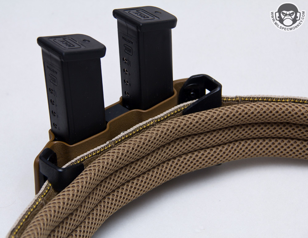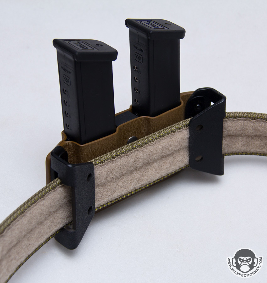 For first impressions .08" thick kydex is used so it gives the gear a solid feel and grip of items. When inserting a pistol or magazine they produce a good positive click noise to confirm full insert placement. The end result grip is also strong which I certainly prefer so I don't have to worry about gear flying out when running around. Grip always takes a special touch since one wants it strong enough so items don't fall out even while upside down, but also not so tight that when you go for your pistol or magazine you just end up pulling on on belt like a jackwagon lever. Fortunately the holster grip is how I like it so I don't miss the lack of tension control, the double magazine carrier however does have a central tension control. On that note they come a bit tight where the lowest tension setting is about where I want it, preferably they should be semi loose and then one would use the tension control to tighten as needed. Also one magazine zone is a little tighter than the other, a common issue with double magazine kydex carriers, but fortunately not a vast difference on this one.