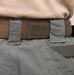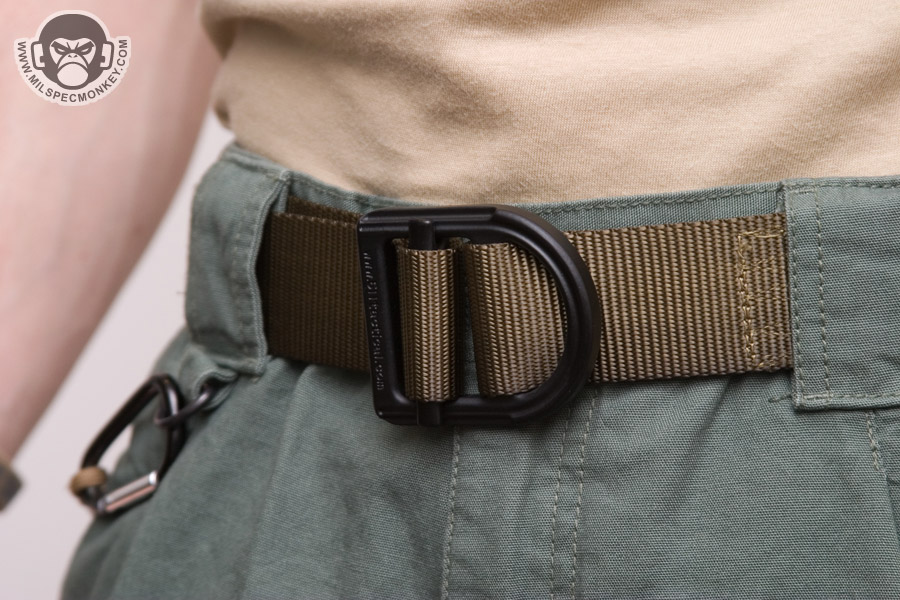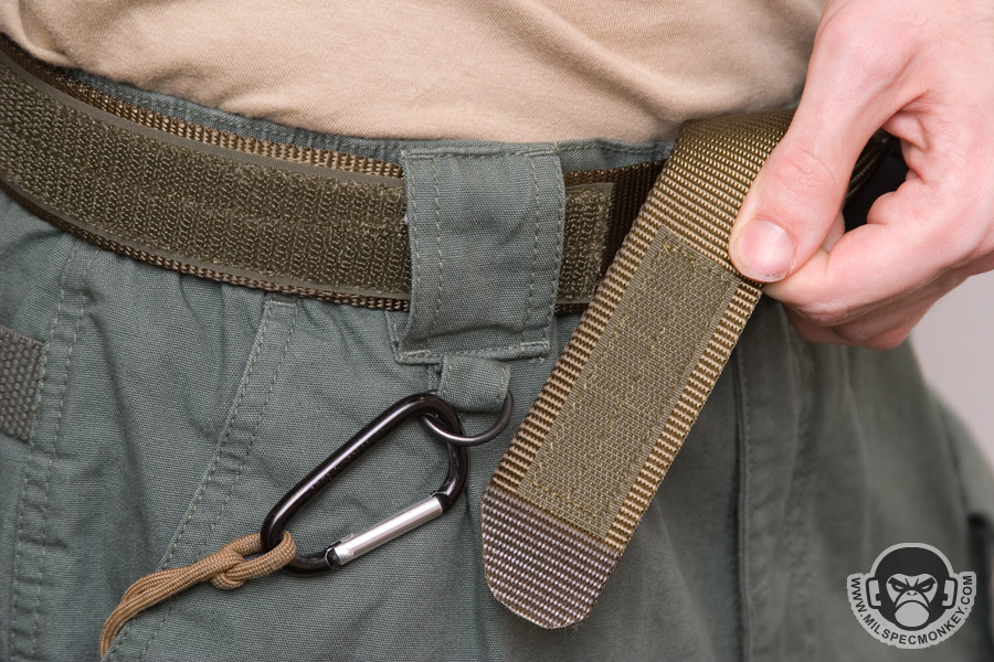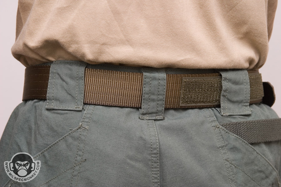The trainer belt is a solid BDU style belt with a custom harness adapter (metal hardware) instead of the usual surplus one. A generous portion of velcro allows for ease in adjustability and security of your extra slack. The end has been rounded off and coated or heat treated so it won't fray. This particular belt is fairly flexible for comfort and is 1.5" wide while the 5.11 Operator belt is 1.75" wide and more stiff. Although mostly meant for holding up your pants, if it came down to it, this belt could withstand the user's full body weight and then some.
