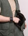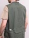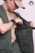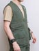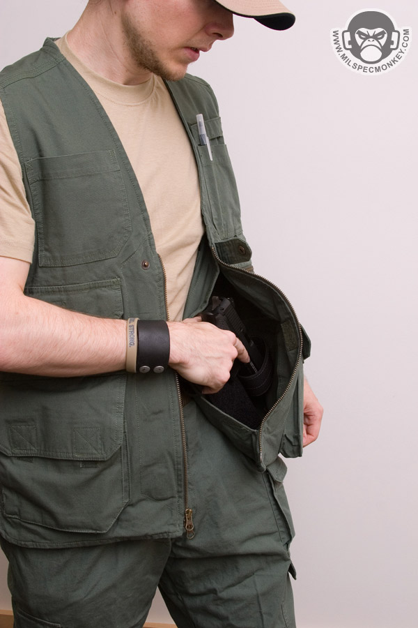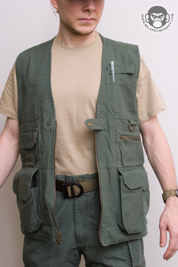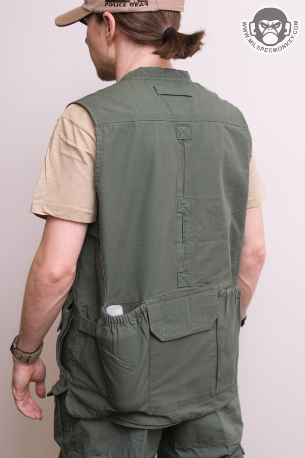 Pockets are everywhere, but key areas include mag pouches on the lower left for the common right handed shooters, a mic clip strap, and 2 water bottle open pockets on the back which can also be used for mags. Interior central access pockets have the "back-up-belt" system so extra attachments can be velcro mounted. I found the connection not solid enough for a heavy pistol, but is fine for flashlights and other lighter gear. The velcro pannels of the back-up-belt system are attached by velcro themselves rather than being sewn in. Since the vest typically rides long, this causes a slight problem with mags in the front mag pockets and makes bending over difficult. The mags line up right in the middle of the waist pivot. Despite the gear specific sized pockets, the fact that most of the vest is tripple stitched makes this version more tactical rather than the usual safari vest. Currently available in black, OD green, and Khaki.