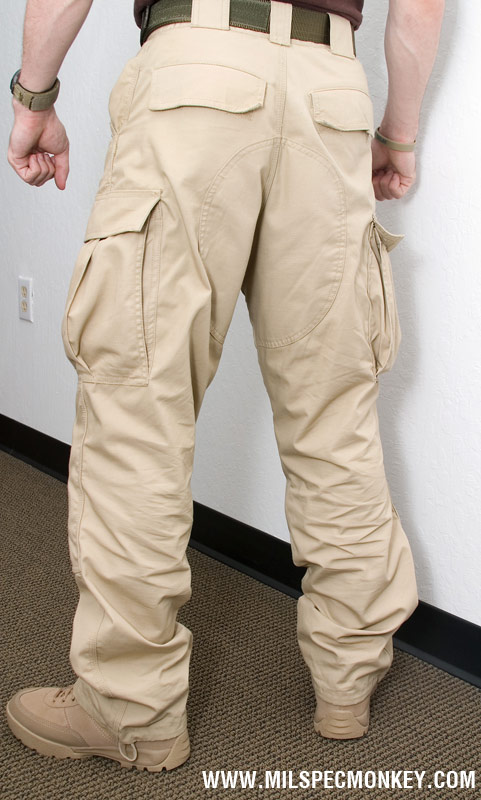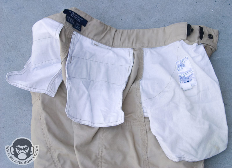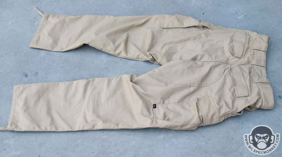 After this I was able to quickly go back to appreciating. I soon did some what would have been stain disasters, but the teflon treating gives the pants a bonus water and stain repellant quality. I like the cargo pocket design a lot. They are roomy and have been sewn with a divider to hold 2, 30 round mags. These spaces are also great for flashlights, multitools, and more. Loop velcro is in there as well to work with 5.11's Back-Up-Belt System to allow attachment of gear specific pouches / holsters. The flaps are velcro closure which are a decent compromise of ease and security. Another great feature is that knee pads come STANDARD. They are neoprene and are inserted through a slot inside the pant to keep things looking clean and simple on the outside. I recently found out the knee pad areas will accept ballistic inserts as well. The fly is a zipper with a metal snap top and backup classic button. The main side upper pockets are roomy and the right one even has a mini sleeve inside to help hold smaller items. The back pockets have velcro closure like the cargo pockets and I find them to work well. They retain the basics like loose change well but are still easy to open. The belt loops are nice a beefy so you don't have to worry about them wearing down. The leg openings have basic pull strings available if you need to close things up to keep out debris. As for suggestions, I'd like to see a D-ring or connection point somewhere since the belt loops are so thick. The two frontal belt loops seem a little close together, but there is probably a reason for that. Maybe it is just me, but I'd like to see two more exterior frontal upper pockets like on my Specwargear pants. With most areas triple stitched, these pants are in it for the long haul. I highly recommend these and at $45 standard price, these are quite a deal considering the quality and included knee pads.