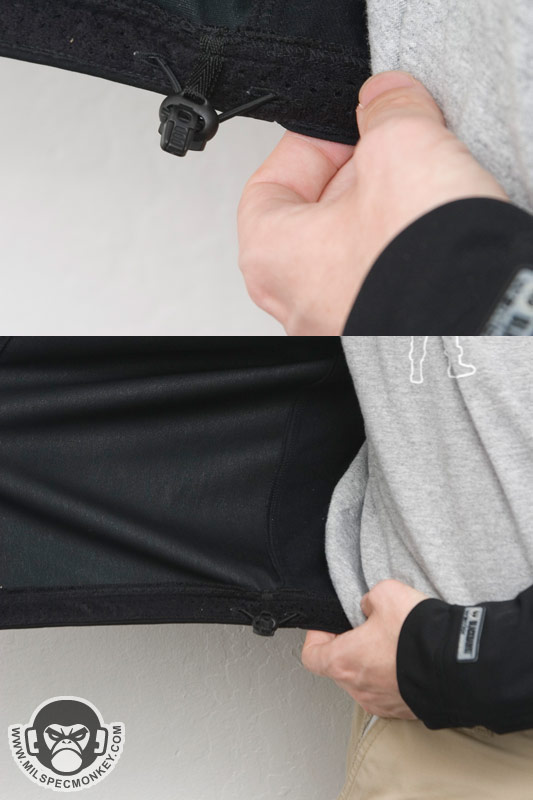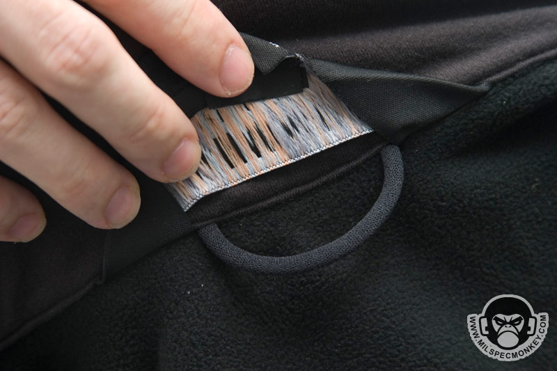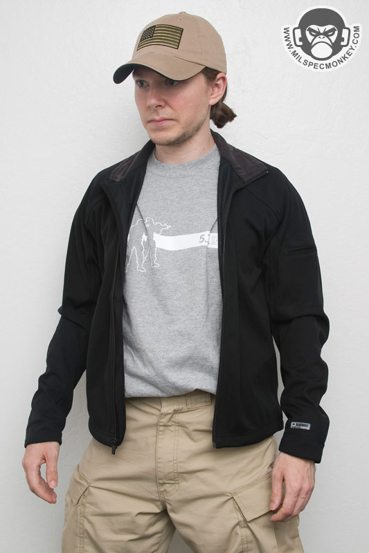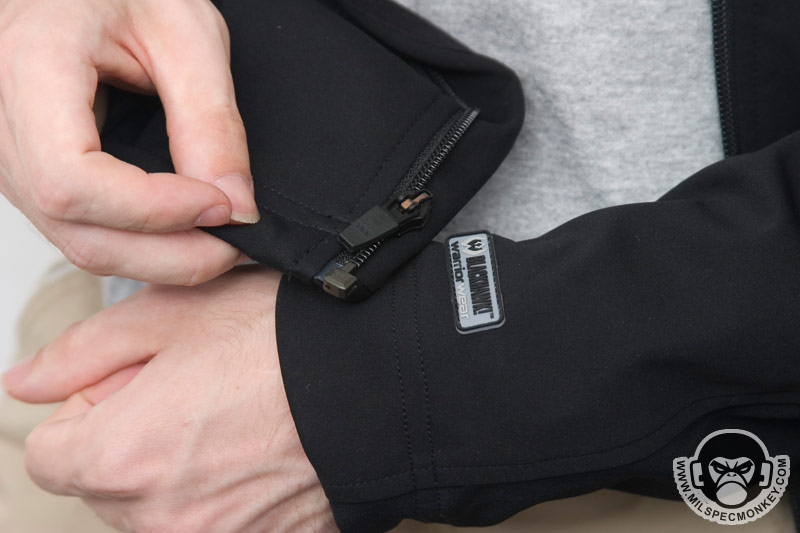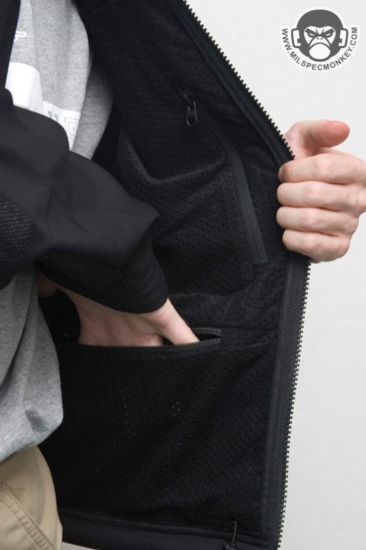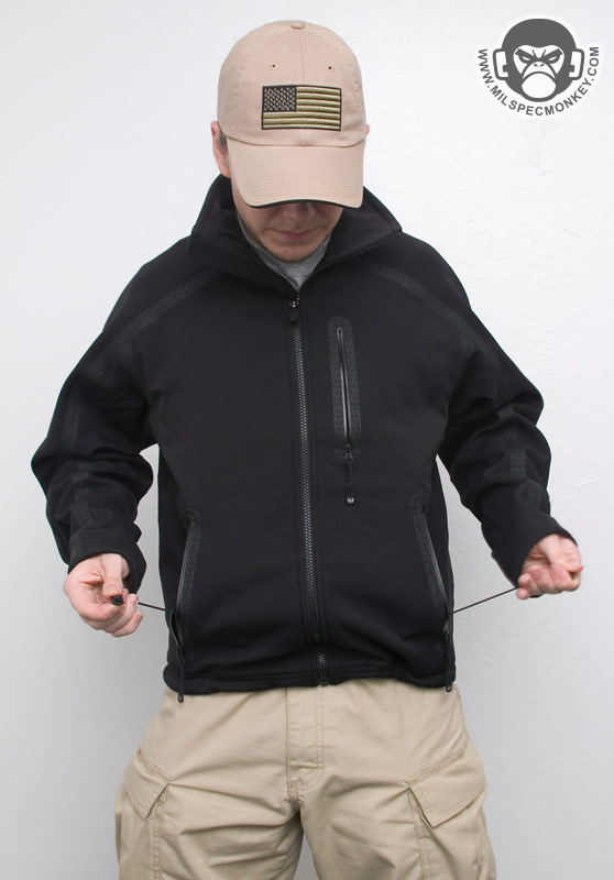 The meat of the jacket system is layer 2, The Ops Jacket. The sizing and thickness is what most expect out of a medium jacket, but it has additional element protection and features. I'm not sure what the main shell material is, but Blackhawk calls it a Durable water-resistant (DWR) soft-shell. All of the outer seams have been sealed by being covered with textured non-slip material and a large batch has been added to the elbows for added durability. The interior is made up of a combination of fleece/tricot and soft mesh to give warmth yet ventilation as well to the right places. The main zipper is that sweet semi auto locking kind as seen on the training jacket. I wonder about how long it will keep its spring/lock ability, but worst case it just becomes a regular floppy zipper. The other external pockets all have waterproof sealed zippers which have little metal tabs and pull cords including custom textured warrior wear tabs. The indented tear-drop shape of the pull tab makes a nice intuitive grip. Symmetrical pockets include 2 side hand pockets, 2 lower internal pockets, and 2 zippers open in the back exterior for access to the same pocket to create a "tailbone" pocket. Inside the hand pockets are convenient shock cord pull tabs so the waist can be be easily cinched. This can later be adjusted with the tiny cordlocks that control the shock cord located at the lower front interior of the jacket. The waist cinch system is separated by grommet holes keeping the pull tabs and cord-locks in place so you don't have to worry about their placement shifting. For asymmetrical pockets there is one on the upper front left externally and slightly lower internally. Just for clarification the would be the left hand side of the user. I can only guess these pockets are only on the left side to be setup for right hand dominant use and leave the right side area more clear for firearms. Either way, I wish the pockets were on the right side as well. I don't think they would get in the way and would give more organization while delivering ambidextrous functionality. A good sized loop is under the tag for hanging of the jacket. Overall feels nice, great performance for its weight and thickness while looking sharp at the same time.