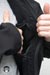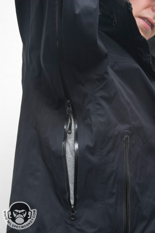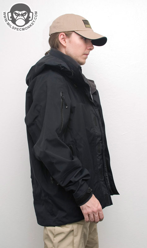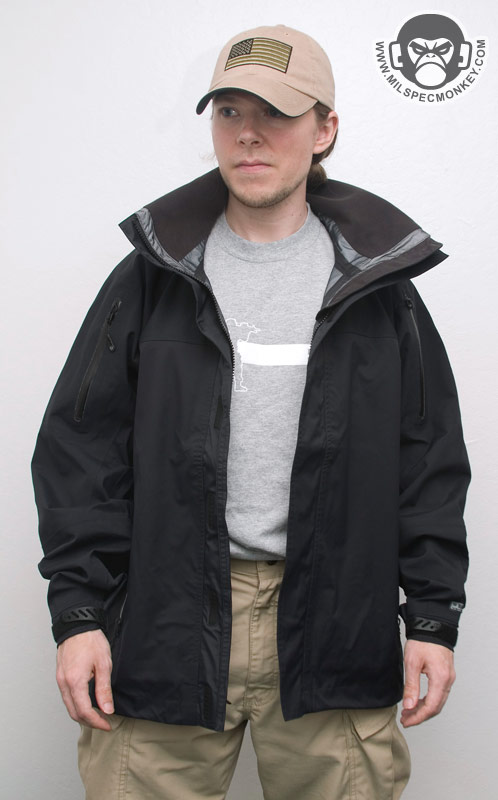 When you know the weather is going to be the suck, this is when you want layer 3. The Element Shell is water and wind proof based on a breathable 3-layer laminate hard-shell. All seams have been sealed internally to insure the water-proof performance. External pockets include 2 large side hand pockets and 2 shoulder pockets. Each pocket has water-proof zipper seals and use the nice custom zipper pulls as seen on the ops jacket. The same zipper setups, except with double sliders, are used on the sides for long pit-zips to allow easy ventilation control. Only the upper slider comes with a zipper pull so if one finds themselves preferring to unzip in a up to down motion, the pull can be removed and installed onto the lower slider. The main opening of the jacket uses a dual-direction zipper which is then made weather-proof with a flap that stays in place with velcro. Many areas include shock-cord and cordlock setups which are at the waist/tailbone area, the frontal bottom, and in the hood on both the opening compression and horizontal "headband" compression. The headband and tailbone cordlocks are a little harder to get to since located on the exterior and interior back sides respectively, but their existence is appreciated for adjustability. Another cool thing about the hood is that the upper back of the jacket has a built in pocket where the hood can be stored when not in use. This is much nicer than having a hood flop around when you don't really need it. As you may have guessed, deployment of the hood from the pocket is easier than stowing which requires taking the jacket off to do effectively. The collar area interior has a nice patch of fleece for comfort making this be the only area one might need to worry about getting wet. Even if a full interior drenching somehow occurs, the fleece is thin enough to dry reasonably fast. The cuffs are adjustable using loop velcro and rubbery straps with velcro compatible hooks built in. The velco dot is good for holding the straps when full hand opening is desired and the longer velcro strips allow the cuffs to be tightened on up. I like the rubber straps since they appear durable and conform to the arm curve. Since there isn't additional padding, the Layer 3 Element shell isn't made for the harsh cold, however it makes a great shell ready for adventures including hurricanes. Don't forget, what Layer 3 lacks in warmth can easily be solved with layers 1 and 2. When combined you got yourself a mean cold and water fighting jacket package.