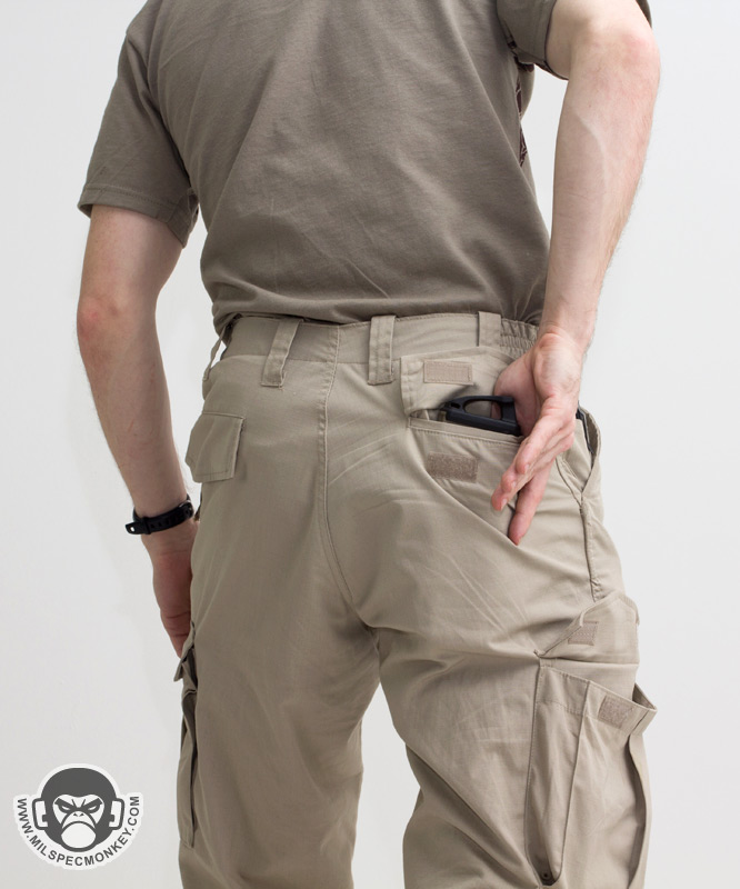 For an improved fit while not using a belt, there are elastic zones built into the upper waist sides. Not too much, just enough to give some elastic flexibility. The fly area uses a simple button and YKK zipper. The zipper has a fabric pull cord that is a small yet useful detail. I'd say the side hand pockets are about medium size. It would be nice to have them slightly bigger, but I didn't run into crowding issues until I had my wallet and ZT knife in the same pocket. The pocket openings have some extra binding tape to increase the durability with any clip items such as knives, but I wish more material was used to give further coverage. Something is certainly better than nothing, however I know the pant will eventually wear a hole just a little further down the pocket. On the right hand side pocket, a bonus coin pocket is integrated which I have mixed feelings about. Despite working well for coins hence the name, the pocket also can be a bit of a snag point when inserting larger items such as a wallet in the main pocket. The coin area can potentially hold smaller folder knives which I think the raised position makes for an easy grab. I'd recommend making the pocket slightly deeper as you can see it is a little short for my ZT 0350, which is not a huge knife. This would require a careful balance as a pocket too deep will make the user look like a chump requiring a finger bang session to retrieve coins.