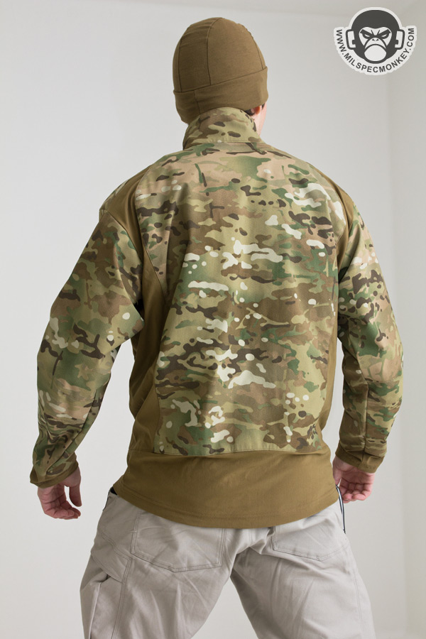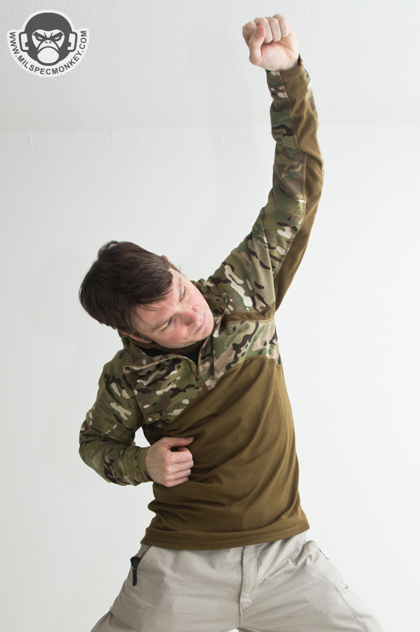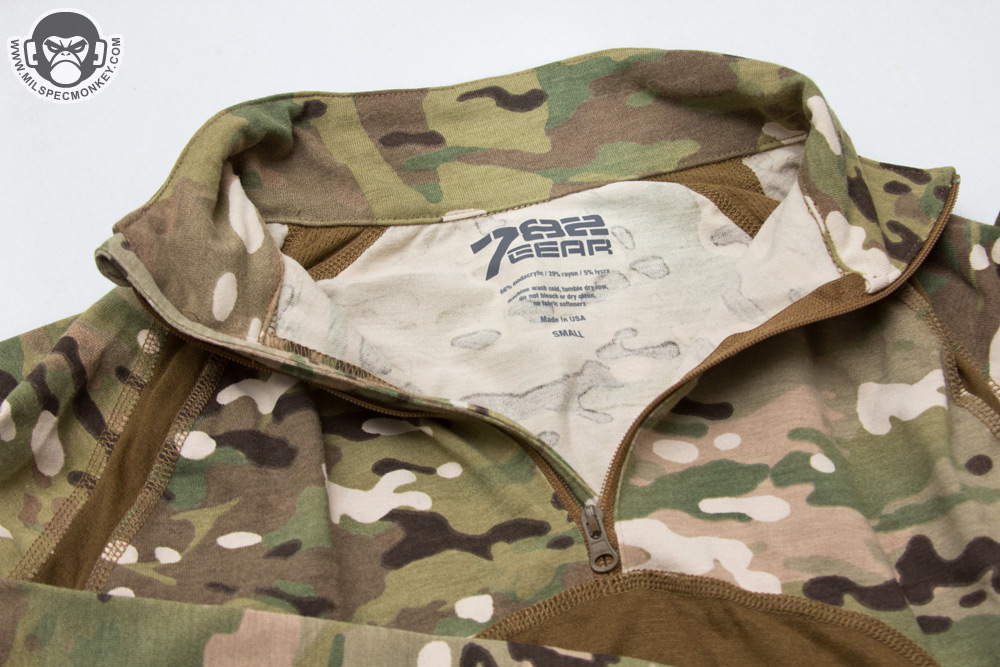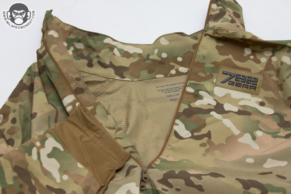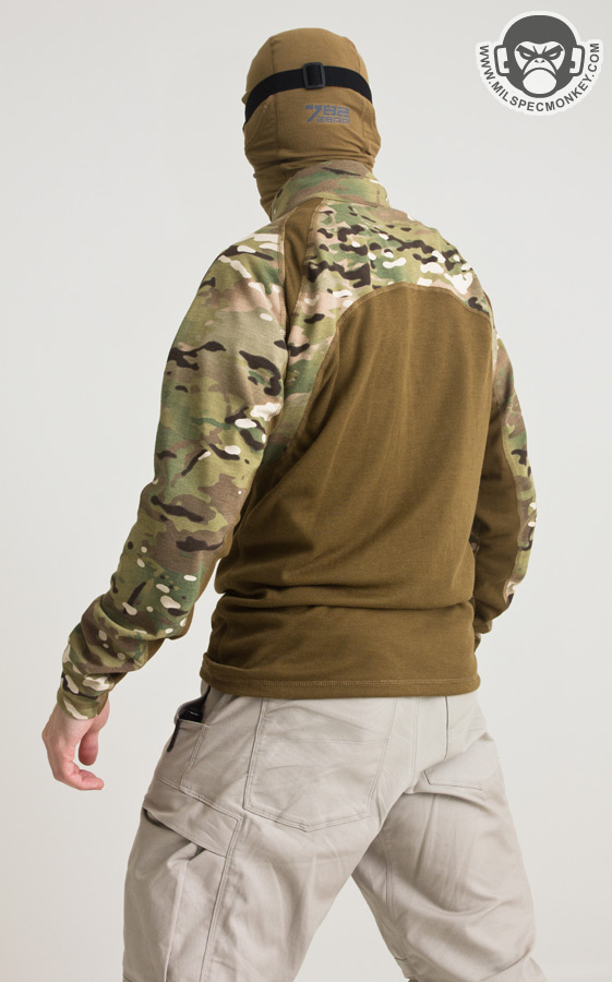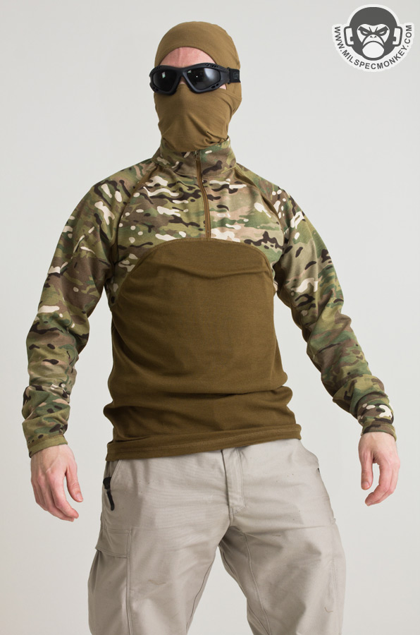 Next up, the Flash-Lite FR BAC ¼ Zip which sports a design to be worn with armor on top. Comprised of CYBERKNIT 9.5 oz. jersey and 5.5 oz Polartec Power Dry FR jersey mesh, this gives Flame Resistance to the exposed parts (shoulders and arms) while giving anti-microbial protection / moisture-wicking to the covered torso areas. The result gives durability for the combat environment with cooling assistance while wearing armor. For those not familiar with this type of setup, any little bit helps when you are sweating your ass off in the desert. A low profile zipper allows adjustment of the collar area ranging from full relaxed to all the way up, giving a mandarin collar effect. Like with most collars of this type, they feel a little funny at first since touching your chin, however it doesn't take long to get used to. The overall shirt length is good, giving plenty enough to tuck into pants without being overkill and bunching up down there. Movement freedom is great likely thanks to both the layout and the stretch qualities of both materials. Since simplistic the BAC is fairly lightweight, but some users will miss features such as pockets or adjustable cuffs. 782 tells me they do have plans to add on some loop velcro fields for unit patches and such. Despite being fancy pants materials, the BAC is overall comfy and feels very cotton like.